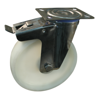 Lenkrolle Edelstahl, 150mm Durchmesser, Polyamid Lauffläche, Gleitlager, Totalfeststeller, Nachlauf