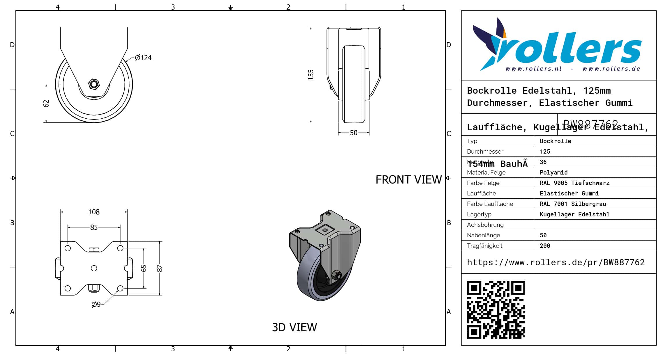 Dies ist eine Bockrolle aus Edelstahl. Die Rolle hat eine Bauhöhe von 154 mm. Das Material der Felge ist Polyamid (RAL 9005 Tiefschwarz ist die Farbe) und der Lauffläche Elastischer Gummi (RAL 7001 Silbergrau ist die Farbe). Das Rad hat einen Durchmesser von 125 mm und eine Breite von 36 mm. Die Bockrolle hat eine Tragfähigkeit von 200 kg. Der Lagertyp: Kugellager Edelstahl. Dieses Produkt finden Sie in unseren Kategorien: Gummiräder, Rollbehälter Rollen, Müllcontainer Rollen, Bockrolle Edelstahl, Bockrollen 200 kg, Bockrollen 125 mm, Transportrollen, Bockrollen.