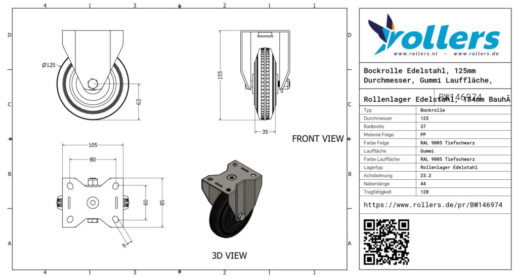 Diese Bockrolle hat eine Gabel aus Edelstahl. Die Bauhöhe ist 154 millimeter. Die Felge besteht aus PP (Farbe RAL 9005 Tiefschwarz) und die Lauffläche aus Gummi (RAL 9005 Tiefschwarz). Das Rad hat einen Durchmesser von 125 millimeter und eine Breite von 37 millimeter. Die Nabenlänge beträgt 44 millimeter und die Achsbohrung hat einen Durchmesser von 23.2 millimeter. Das Rad hat eine Tragfähigkeit von 120 kilo. Das Rad hat ein Rollenlager Edelstahl als Lagerung. Dieses Produkt ist in unserem Shop in folgenden Kategorien erhältlich: Gummiräder, Rollbehälter Rollen, Müllcontainer Rollen, Bockrolle Edelstahl, Bockrollen 100 kg, Bockrollen 125 mm, Transportrollen, Bockrollen.