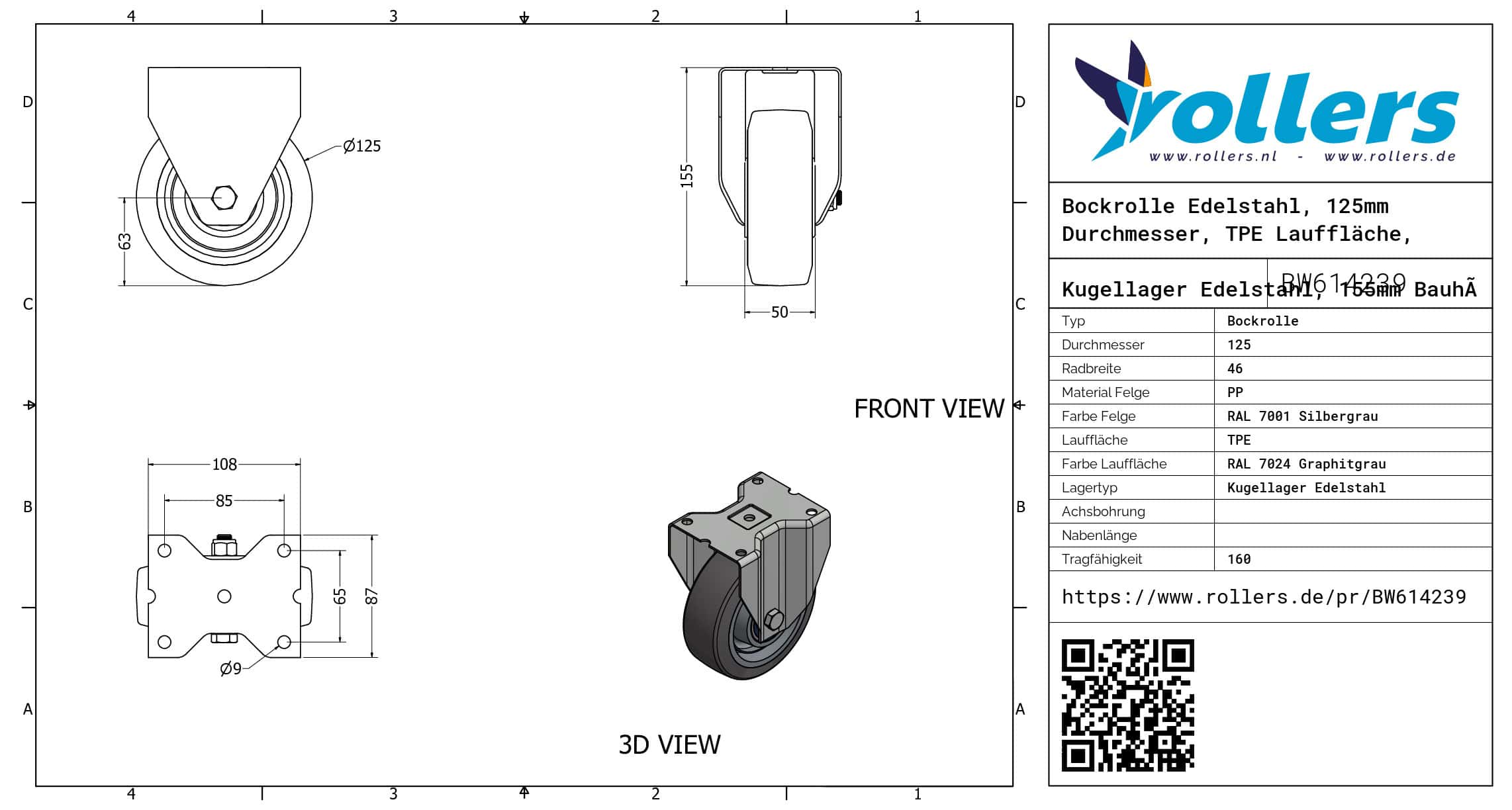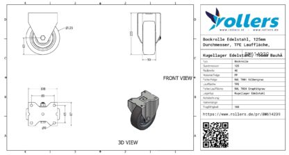 Dies ist eine Bockrolle aus Edelstahl. Die Bauhöhe beträgt 155 millimeter. Die Felge besteht aus PP (Farbe RAL 7001 Silbergrau) und die Lauffläche aus TPE (RAL 7024 Graphitgrau ist die Farbe). Das Rad hat einen Durchmesser von 125 millimeter und eine Breite von 46 millimeter. Die Tragfähigkeit beträgt 160 kg. Das Rad hat ein Kugellager Edelstahl als Lagerung. Marke: Novio.