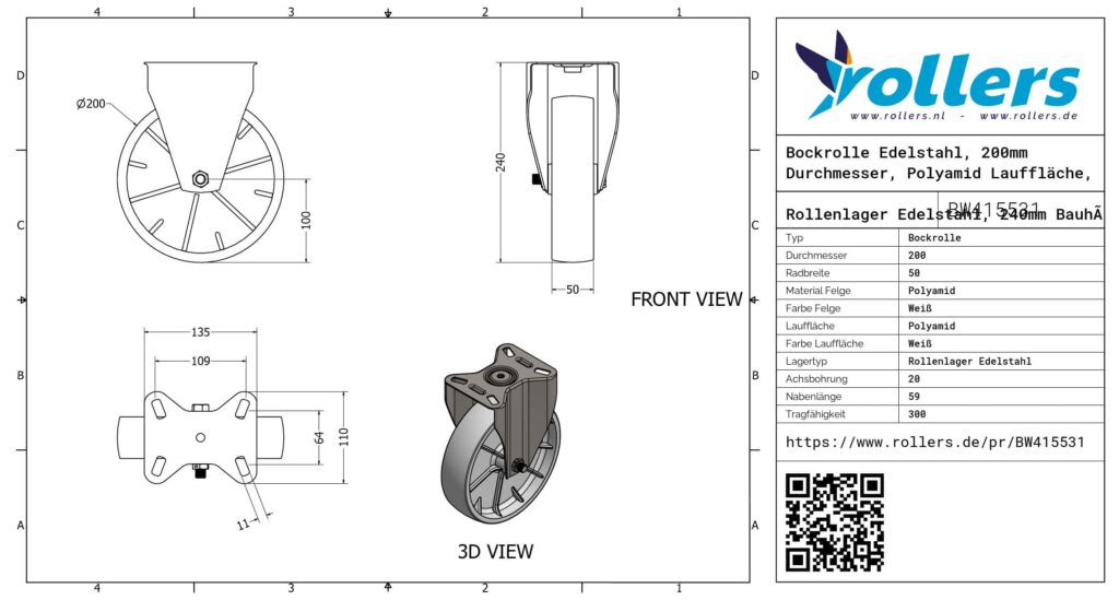 Bockrolle Edelstahl, 200mm Durchmesser, Polyamid Lauffläche, Rollenlager Edelstahl, 240mm Bauhöhe