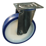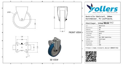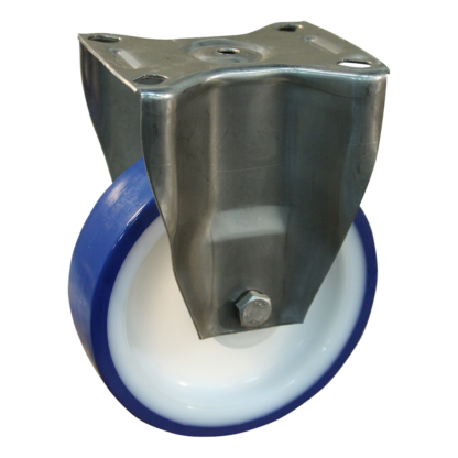 Bockrolle Edelstahl, 200mm Durchmesser, PU Lauffläche, Gleitlager, 240mm Bauhöhe
