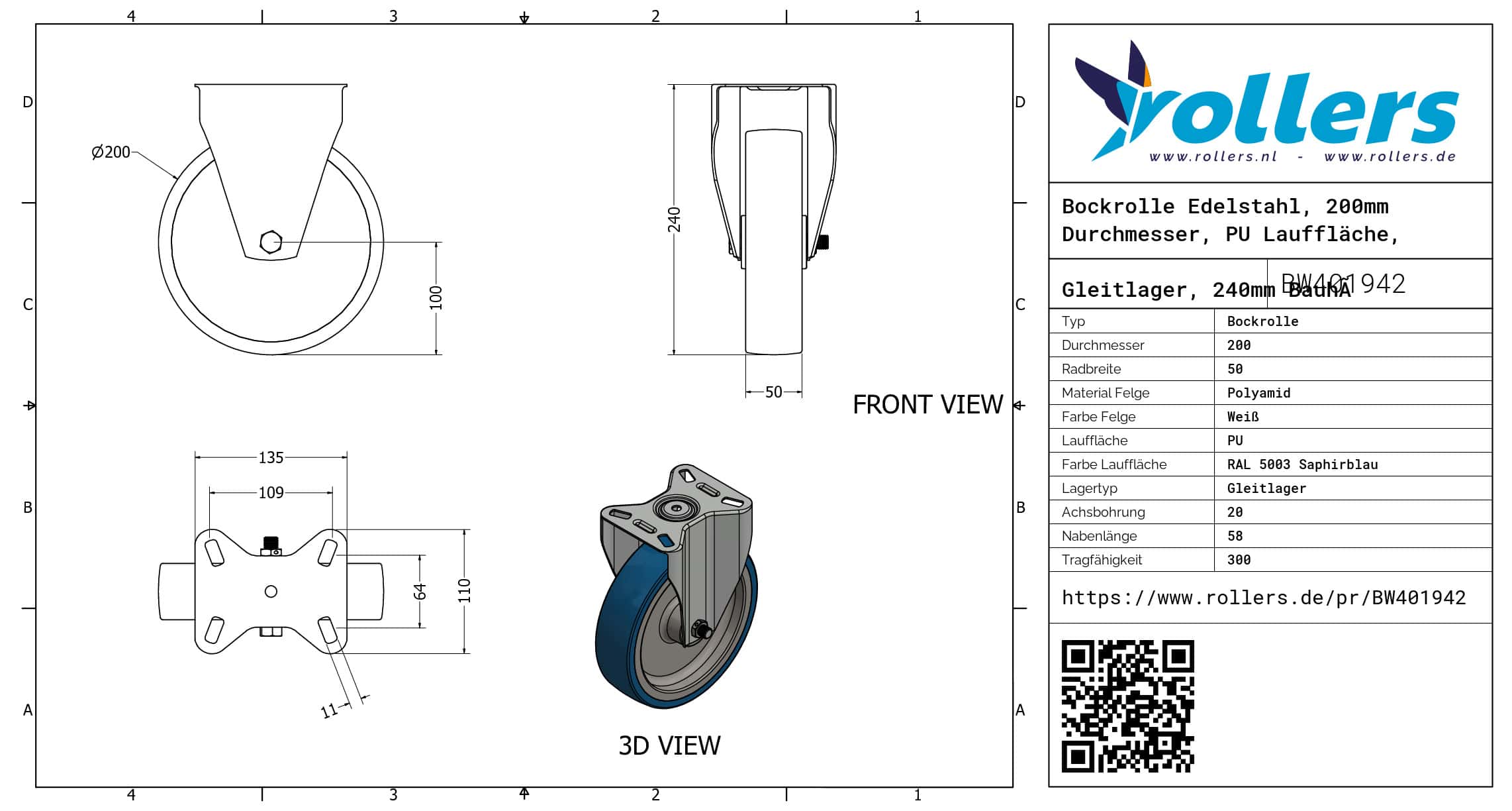 Diese Bockrolle hat eine Gabel aus Edelstahl. Die Bauhöhe ist 240 millimeter. Die Felge besteht aus Polyamid (Farbe weiß) und die Lauffläche aus PU (RAL 5003 Saphirblau ist die Farbe). Das Rad hat einen Durchmesser von 200 millimeter und eine Breite von 50 millimeter. Die Nabenlänge beträgt 58 millimeter und die Achsbohrung hat einen Durchmesser von 20 millimeter. Die Tragfähigkeit beträgt 300 kg. Das Rad hat ein Gleitlager als Lagerung. Dieses Produkt finden Sie in unseren Kategorien: Rollbehälter Rollen, Müllcontainer Rollen, Bockrolle Edelstahl, Schwerlastbockrollen, Bockrollen 300 kg, Schwerlastrollen, PU Rollen, Bockrollen 200 mm, Polyurethan Rollen, Transportrollen, Bockrollen.