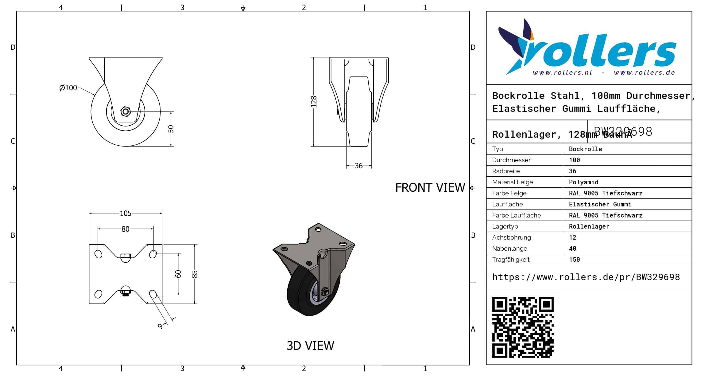 Dies ist eine Bockrolle aus Stahl. Die Bauhöhe ist 128 mm. Das Material der Felge ist Polyamid (Farbe RAL 9005 Tiefschwarz) und der Lauffläche Elastischer Gummi (Farbe RAL 9005 Tiefschwarz). Das Rad hat einen Durchmesser von 100 mm und eine Breite von 36 mm. Die Nabenlänge beträgt 40 mm und die Achsbohrung hat einen Durchmesser von 12 mm. Das Rad hat eine Tragfähigkeit von 150 kilo. Das Rad hat ein Rollenlager als Lagerung. Rollers.de hat dieses Produkt in die folgenden Kategorien eingeteilt: Gummiräder, Rollbehälter Rollen, Müllcontainer Rollen, Bockrollen 150 kg, Bockrollen 100 mm, Transportrollen, Bockrollen.