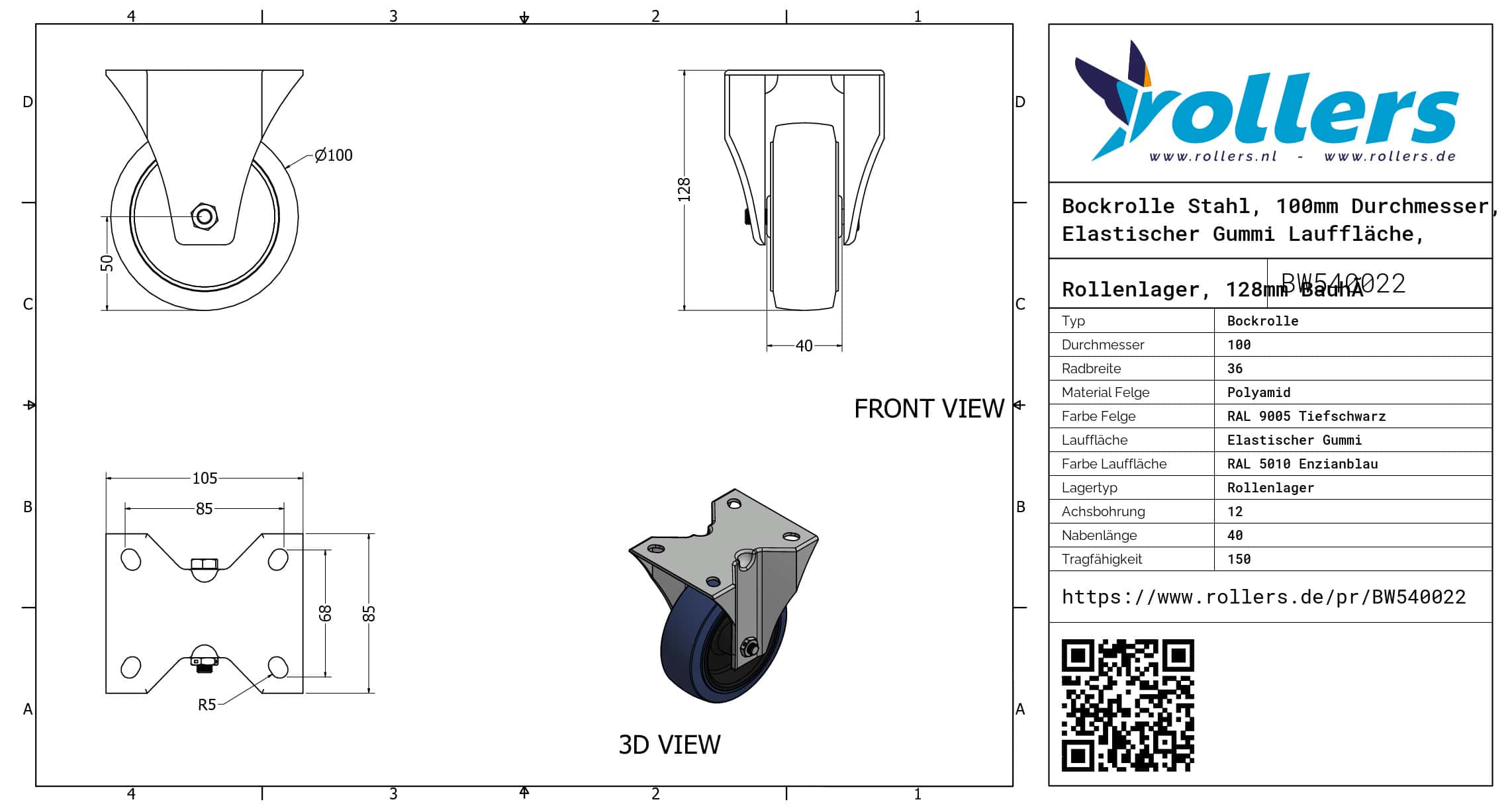 Dies ist eine Bockrolle aus Stahl. Die Bauhöhe beträgt 128 mm. Das Material der Felge ist Polyamid (RAL 9005 Tiefschwarz) und der Lauffläche Elastischer Gummi (RAL 5010 Enzianblau ist die Farbe). Das Rad hat einen Durchmesser von 100 mm und eine Breite von 36 mm. Die Nabenlänge beträgt 40 mm mit einem Achsloch von 12 mm. Die Tragfähigkeit beträgt 150 kilo. Das Rad hat ein Rollenlager als Lagerung. Dieses Produkt ist in unserem Shop in folgenden Kategorien erhältlich: Flightcase-Räder, Gummiräder, Rollbehälter Rollen, Müllcontainer Rollen, Bockrollen 150 kg, Bockrollen 100 mm, Transportrollen, Bockrollen.