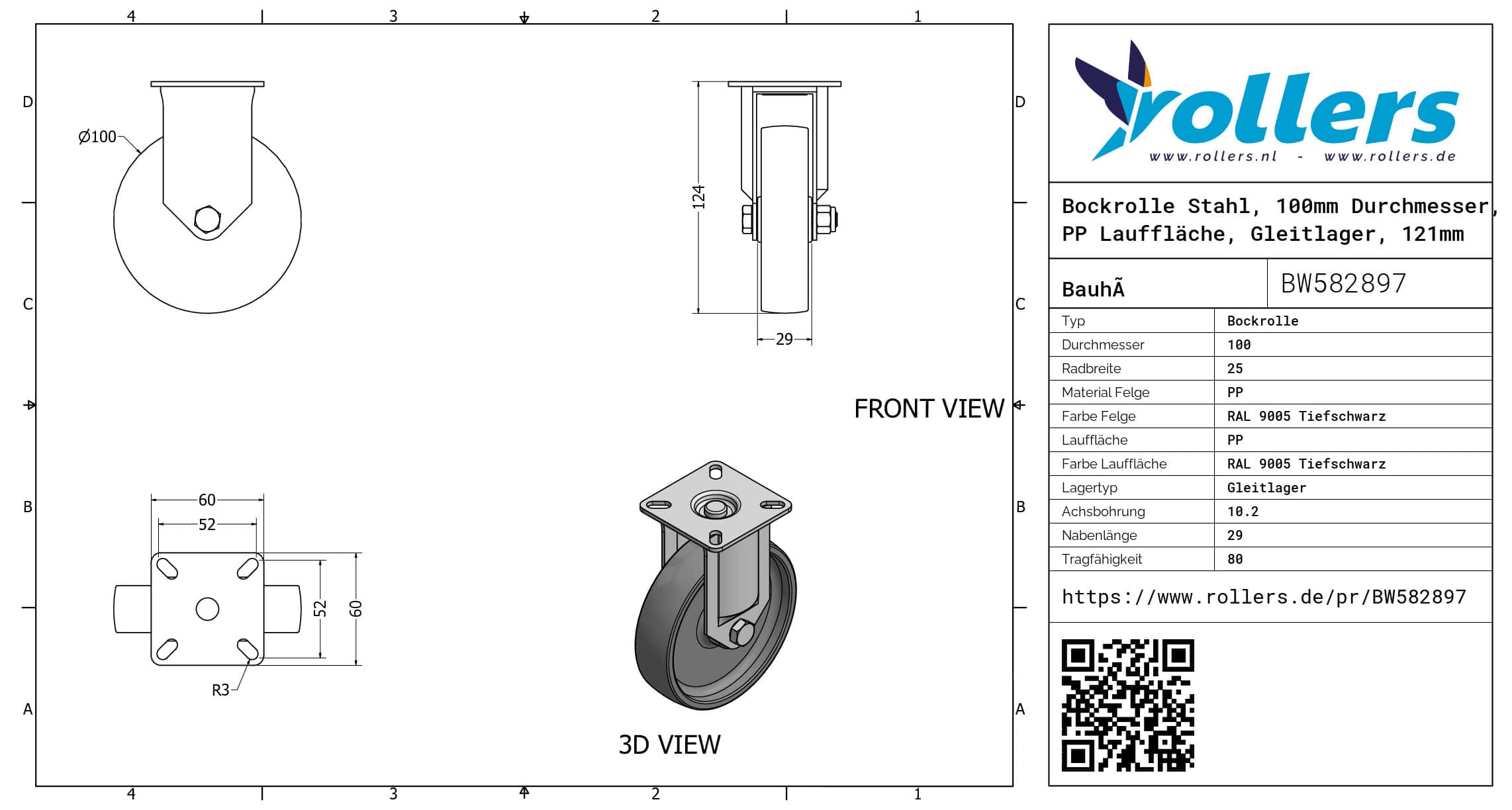 Diese Bockrolle hat eine Gabel aus Stahl. Die Bauhöhe ist 121 millimeter. Das Material der Felge ist PP (RAL 9005 Tiefschwarz ist die Farbe) und der Lauffläche PP (RAL 9005 Tiefschwarz). Das Rad hat einen Durchmesser von 100 millimeter und eine Breite von 25 millimeter. Die Nabenlänge beträgt 29 millimeter mit einem Achsloch von 10.2 millimeter. Die Bockrolle hat eine Tragfähigkeit von 80 kilogram. Das Rad hat ein Gleitlager als Lagerung. Rollers.de hat dieses Produkt in die folgenden Kategorien eingeteilt: Bockrollen 50 kg, Bockrollen 100 mm, Bockrollen. Marke: Novio.