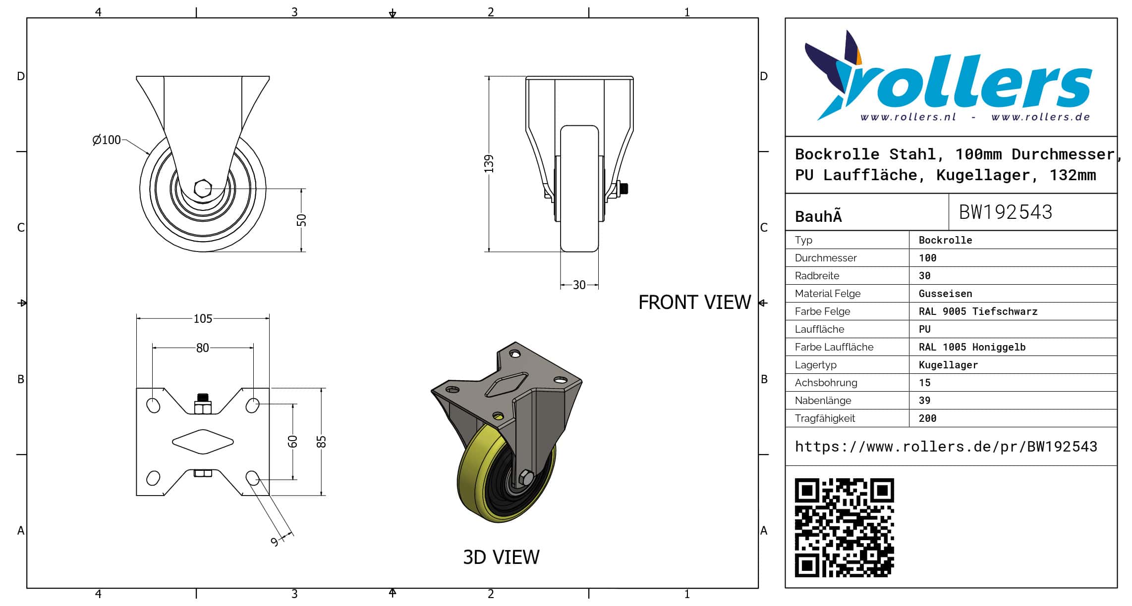 Dies ist eine Bockrolle aus Stahl. Die Bauhöhe beträgt 132 millimeter. Das Material der Felge ist Gusseisen (RAL 9005 Tiefschwarz ist die Farbe) und der Lauffläche PU (RAL 1005 Honiggelb). Das Rad hat einen Durchmesser von 100 millimeter und eine Breite von 30 millimeter. Die Nabenlänge beträgt 39 millimeter mit einem Achsloch von 15 millimeter. Das Rad hat eine Tragfähigkeit von 200 kilo. Das Rad hat ein Kugellager als Lagerung. Dieses Produkt finden Sie in unseren Kategorien: Rollbehälter Rollen, Müllcontainer Rollen, Bockrollen 200 kg, Bockrollen 100 mm, PU Rollen, Polyurethan Rollen, Transportrollen, Bockrollen.