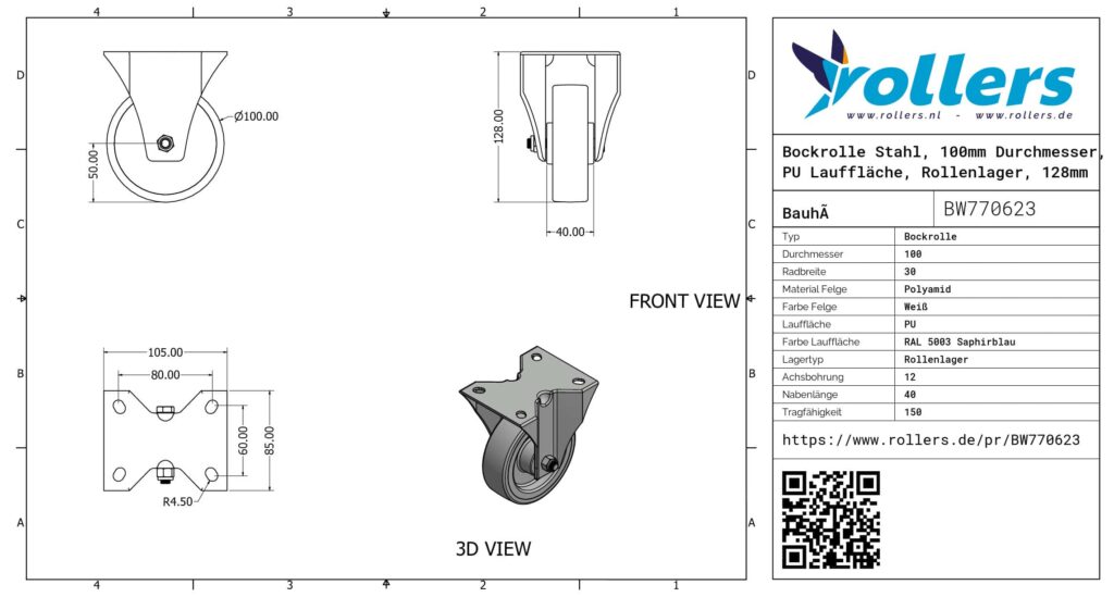 Bockrolle Stahl, 100mm Durchmesser, PU Lauffläche, Rollenlager, 128mm Bauhöhe