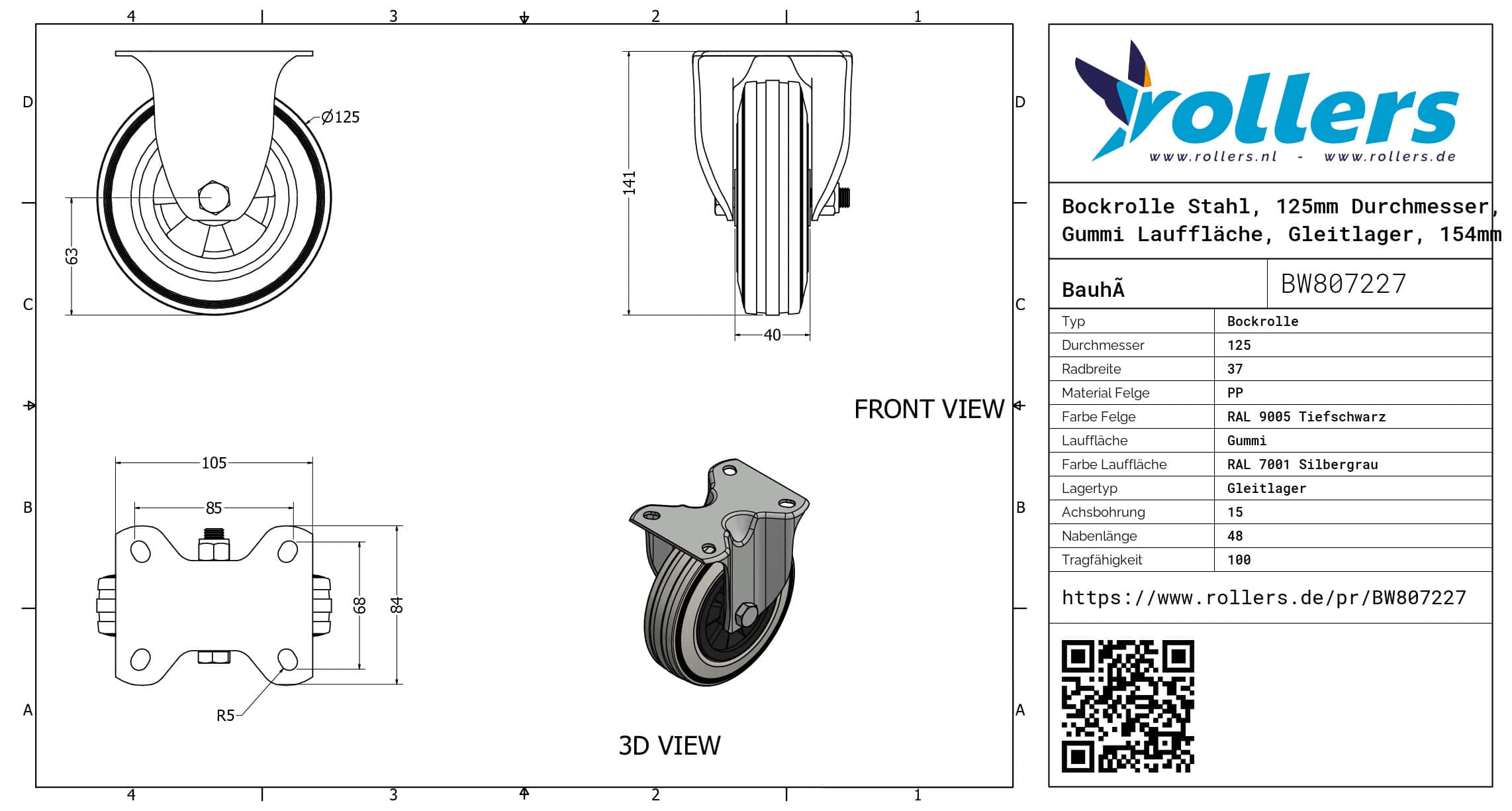 Dies ist eine Bockrolle aus Stahl. Die Bauhöhe beträgt 154 mm. Die Felge besteht aus PP (RAL 9005 Tiefschwarz) und die Lauffläche aus Gummi (RAL 7001 Silbergrau). Das Rad hat einen Durchmesser von 125 mm und eine Breite von 37 mm. Die Nabenlänge beträgt 48 mm und die Achsbohrung hat einen Durchmesser von 15 mm. Die Tragfähigkeit beträgt 100 kilo. Der Lagertyp: Gleitlager. Dieses Produkt finden Sie in unseren Kategorien: Gummiräder, Rollbehälter Rollen, Müllcontainer Rollen, Bockrollen 100 kg, Bockrollen 125 mm, Transportrollen, Bockrollen.