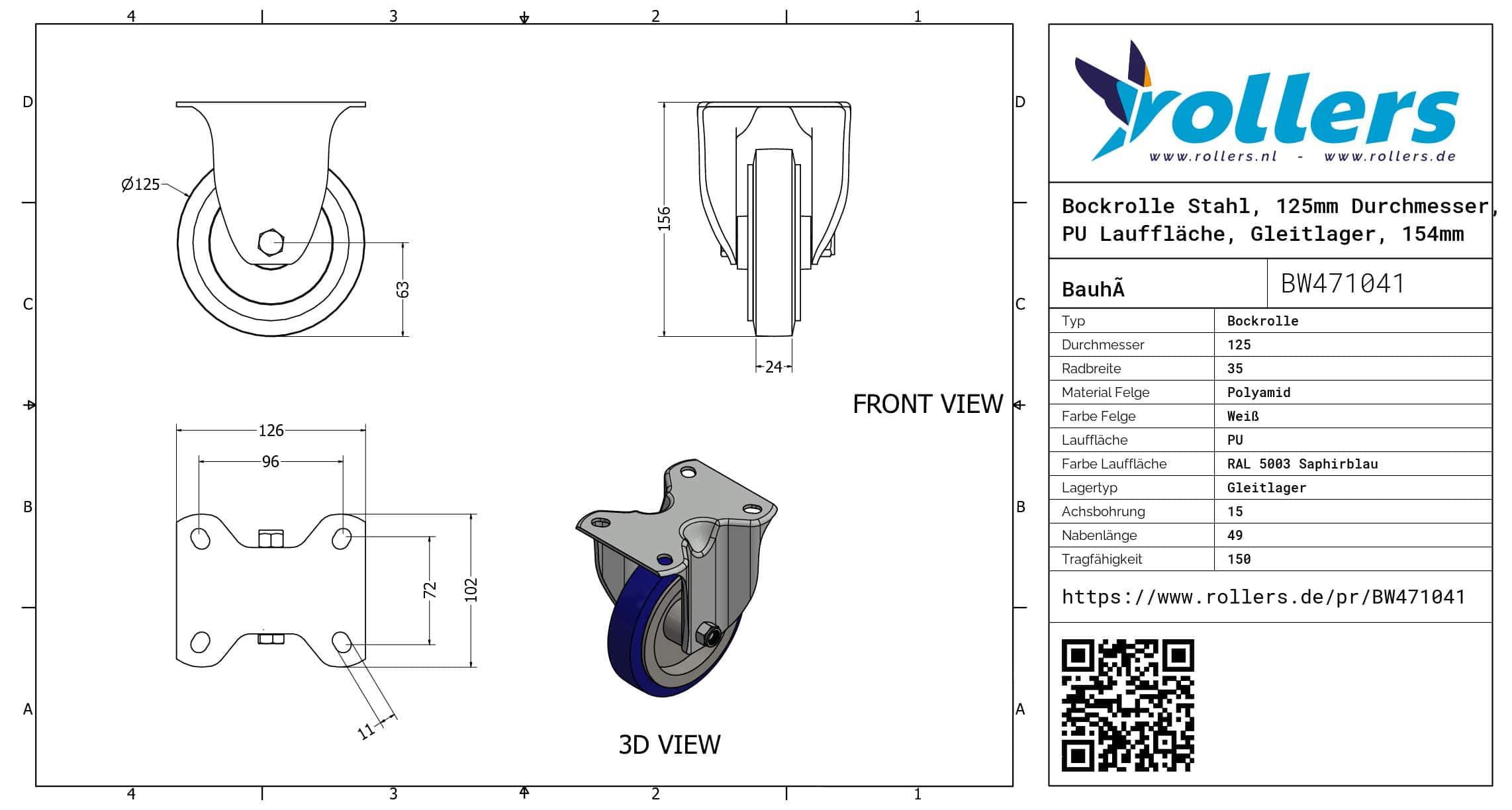 Dies ist eine Bockrolle aus Stahl. Die Bauhöhe beträgt 154 mm. Das Material der Felge ist Polyamid (Farbe weiß) und der Lauffläche PU (RAL 5003 Saphirblau ist die Farbe). Das Rad hat einen Durchmesser von 125 mm und eine Breite von 35 mm. Die Nabenlänge beträgt 49 mm mit einem Achsloch von 15 mm. Das Rad hat eine Tragfähigkeit von 150 kilo. Das Rad hat ein Gleitlager als Lagerung. Dieses Produkt ist in unserem Shop in folgenden Kategorien erhältlich: Rollbehälter Rollen, Müllcontainer Rollen, Bockrollen 150 kg, Bockrollen 125 mm, PU Rollen, Polyurethan Rollen, Transportrollen, Bockrollen.