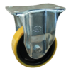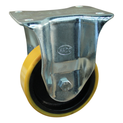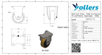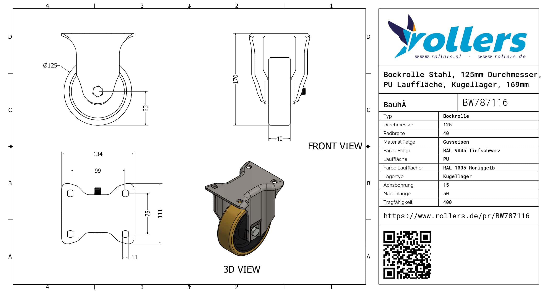 Diese Bockrolle hat eine Gabel aus Stahl. Die Bauhöhe ist 169 mm. Das Material der Felge ist Gusseisen (RAL 9005 Tiefschwarz ist die Farbe) und der Lauffläche PU (RAL 1005 Honiggelb). Das Rad hat einen Durchmesser von 125 mm und eine Breite von 40 mm. Die Nabenlänge beträgt 50 mm mit einem Achsloch von 15 mm. Die Bockrolle hat eine Tragfähigkeit von 400 kilo. Der Lagertyp: Kugellager. Dieses Produkt ist in unserem Shop in folgenden Kategorien erhältlich: Rollbehälter Rollen, Müllcontainer Rollen, Schwerlastbockrollen, Bockrollen 300 kg, Schwerlastrollen, Bockrollen 125 mm, PU Rollen, Polyurethan Rollen, Transportrollen, Bockrollen.