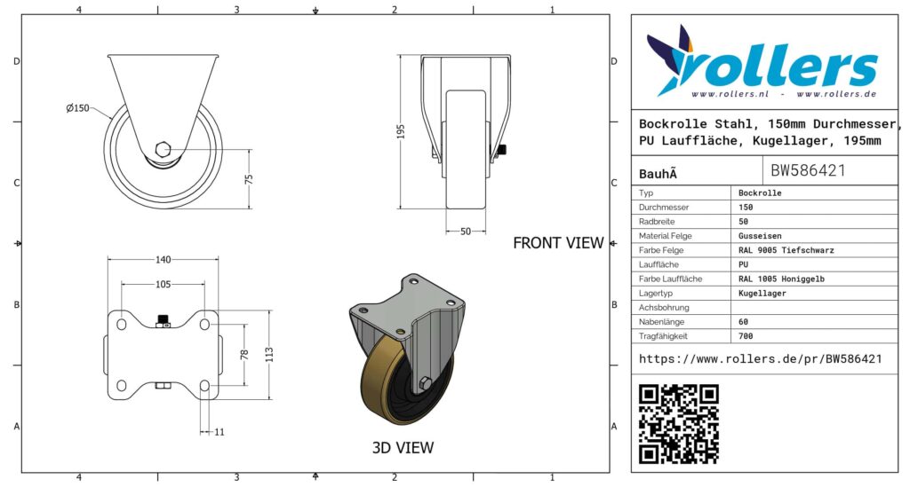 Dies ist eine Bockrolle aus Stahl. Die Bauhöhe ist 195 mm. Die Felge besteht aus Gusseisen (RAL 9005 Tiefschwarz) und die Lauffläche aus PU (RAL 1005 Honiggelb). Das Rad hat einen Durchmesser von 150 mm und eine Breite von 50 mm. Das Rad hat eine Tragfähigkeit von 700 kilogram. Der Lagertyp: Kugellager. Dieses Produkt ist in unserem Shop in folgenden Kategorien erhältlich: Schwerlastbockrollen, Bockrollen 500 kg, Schwerlastrollen, PU Rollen, Bockrollen 150 mm, Polyurethan Rollen, Transportrollen, Bockrollen.