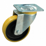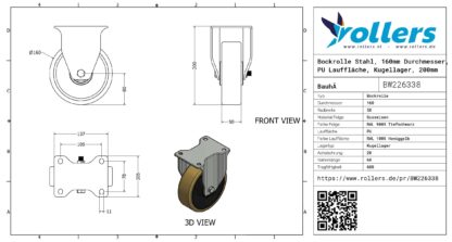 Dies ist eine Bockrolle mit einem Gabel aus Stahl. Die Bauhöhe beträgt 200 millimeter. Die Felge besteht aus Gusseisen (Farbe RAL 9005 Tiefschwarz) und die Lauffläche aus PU (RAL 1005 Honiggelb ist die Farbe). Das Rad hat einen Durchmesser von 160 millimeter und eine Breite von 50 millimeter. Die Nabenlänge beträgt 60 millimeter mit einem Achsloch von 20 millimeter. Die Tragfähigkeit beträgt 600 kilo. Das Rad hat ein Kugellager als Lagerung.