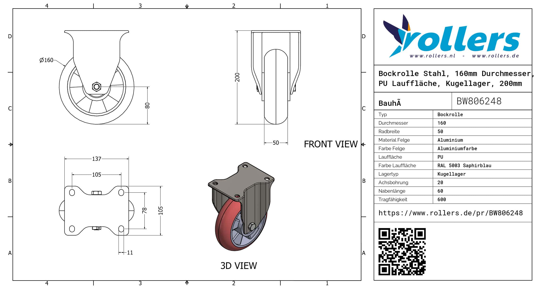 Diese Bockrolle hat eine Gabel aus Stahl. Die Rolle hat eine Bauhöhe von 200 millimeter. Das Material der Felge ist Aluminium und der Lauffläche PU (RAL 5003 Saphirblau). Das Rad hat einen Durchmesser von 160 millimeter und eine Breite von 50 millimeter. Die Nabenlänge beträgt 60 millimeter mit einem Achsloch von 20 millimeter. Die Tragfähigkeit beträgt 600 kilo. Das Rad hat ein Kugellager als Lagerung. Dieses Produkt ist in unserem Shop in folgenden Kategorien erhältlich: Rollbehälter Rollen, Müllcontainer Rollen, Schwerlastbockrollen, Bockrollen 500 kg, Schwerlastrollen, PU Rollen, Bockrollen 160 mm, Polyurethan Rollen, Transportrollen, Bockrollen.