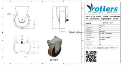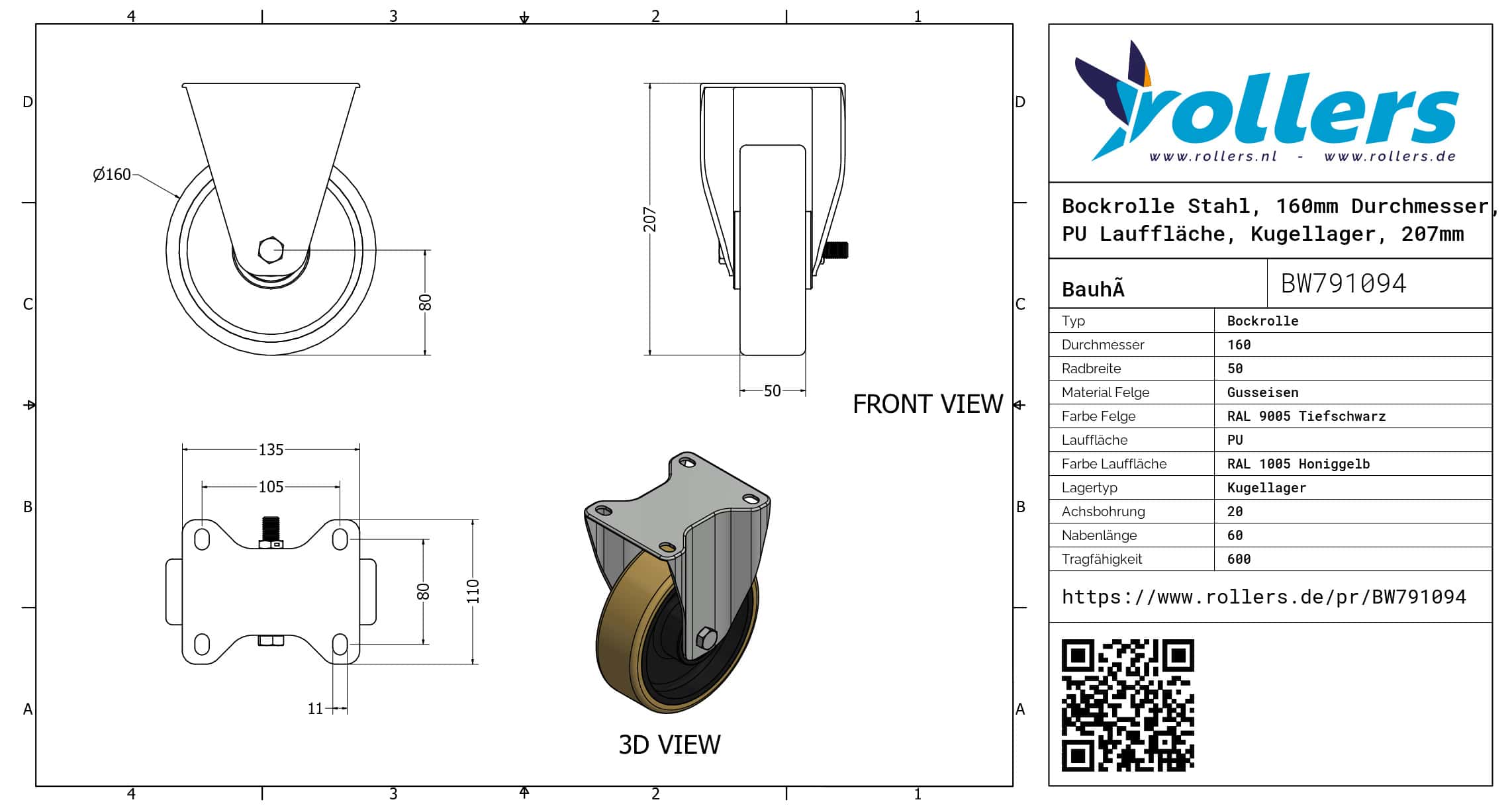 Dies ist eine Bockrolle aus Stahl. Die Bauhöhe beträgt 207 millimeter. Die Felge besteht aus Gusseisen (RAL 9005 Tiefschwarz) und die Lauffläche aus PU (RAL 1005 Honiggelb). Das Rad hat einen Durchmesser von 160 millimeter und eine Breite von 50 millimeter. Die Nabenlänge beträgt 60 millimeter und die Achsbohrung hat einen Durchmesser von 20 millimeter. Das Rad hat eine Tragfähigkeit von 600 kilo. Der Lagertyp: Kugellager. Rollers.de hat dieses Produkt in die folgenden Kategorien eingeteilt: Rollbehälter Rollen, Müllcontainer Rollen, Schwerlastbockrollen, Bockrollen 500 kg, Schwerlastrollen, PU Rollen, Bockrollen 160 mm, Polyurethan Rollen, Transportrollen, Bockrollen.