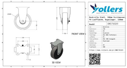 Bockrolle Stahl, 180mm Durchmesser, PU Lauffläche, Kugellager, 238mm Bauhöhe