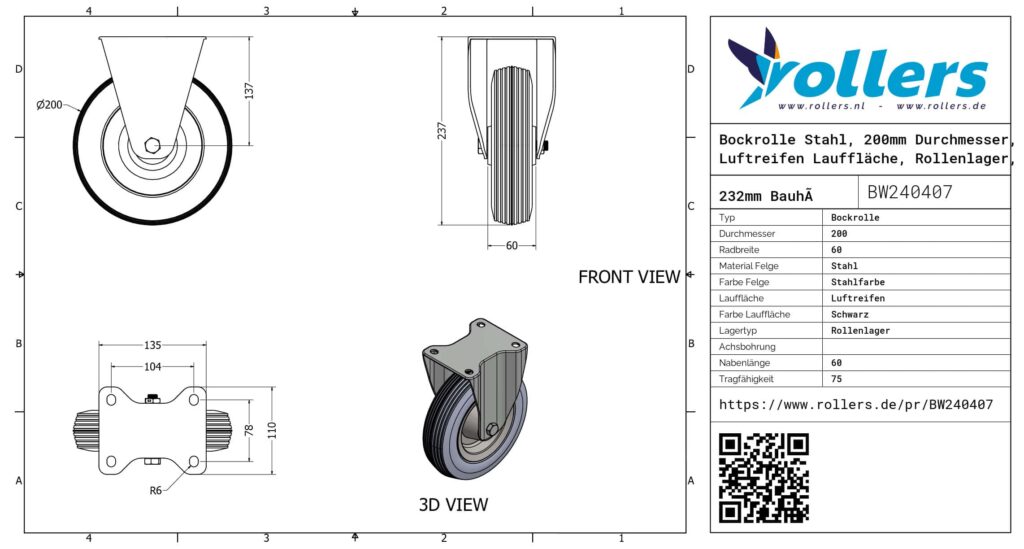 Bockrolle Stahl, 200mm Durchmesser, Luftreifen Lauffläche, Rollenlager, 232mm Bauhöhe