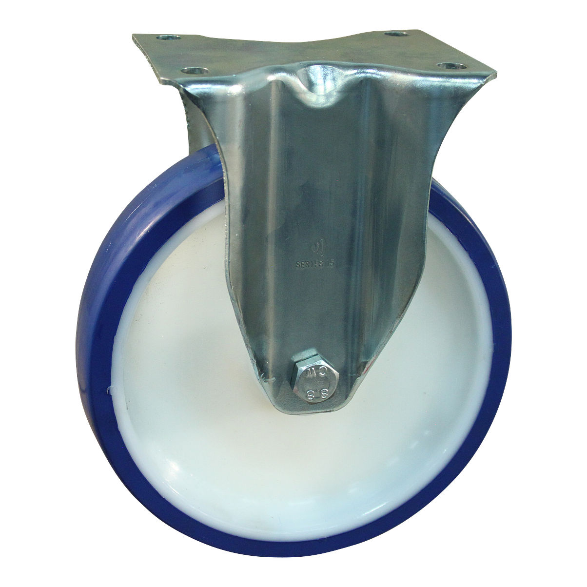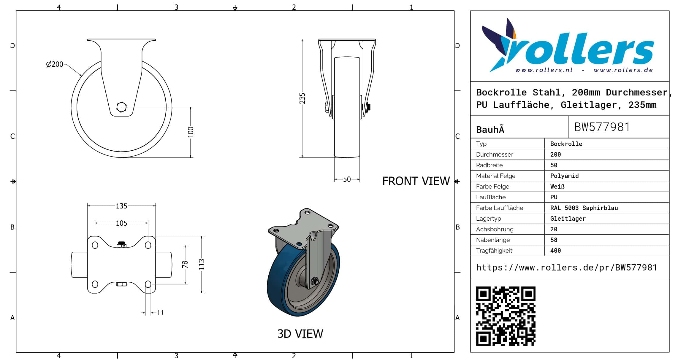 Diese Bockrolle hat eine Gabel aus Stahl. Die Bauhöhe beträgt 235 mm. Das Material der Felge ist Polyamid (weiß) und der Lauffläche PU (Farbe RAL 5003 Saphirblau). Das Rad hat einen Durchmesser von 200 mm und eine Breite von 50 mm. Die Nabenlänge beträgt 58 mm mit einem Achsloch von 20 mm. Die Bockrolle hat eine Tragfähigkeit von 400 kilo. Der Lagertyp: Gleitlager. Dieses Produkt finden Sie in unseren Kategorien: Rollbehälter Rollen, Müllcontainer Rollen, Schwerlastbockrollen, Bockrollen 300 kg, Schwerlastrollen, PU Rollen, Bockrollen 200 mm, Polyurethan Rollen, Transportrollen, Bockrollen.