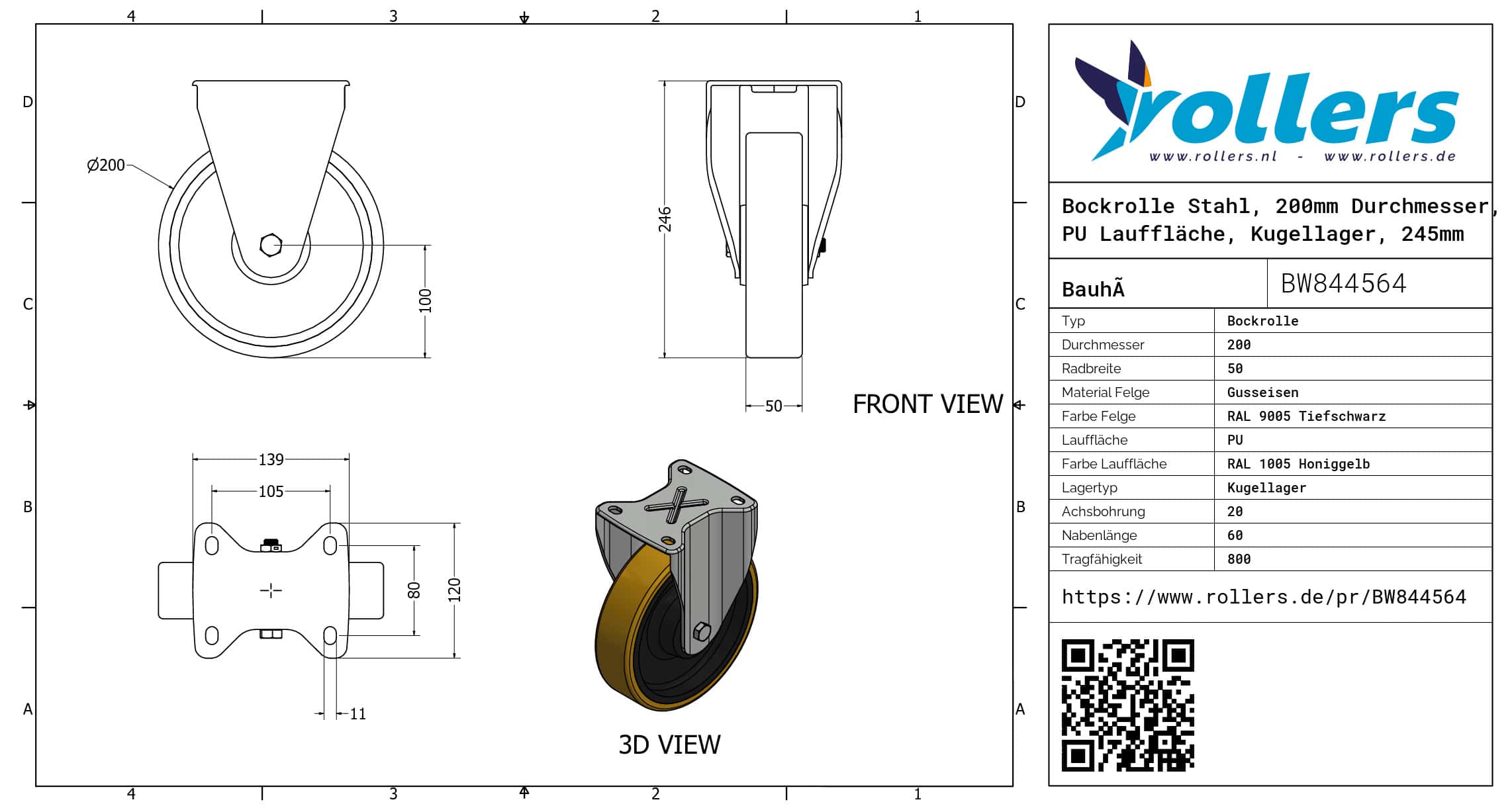 Diese Bockrolle hat eine Gabel aus Stahl. Die Rolle hat eine Bauhöhe von 245 millimeter. Das Material der Felge ist Gusseisen (RAL 9005 Tiefschwarz) und der Lauffläche PU (Farbe RAL 1005 Honiggelb). Das Rad hat einen Durchmesser von 200 millimeter und eine Breite von 50 millimeter. Die Nabenlänge beträgt 60 millimeter mit einem Achsloch von 20 millimeter. Die Bockrolle hat eine Tragfähigkeit von 800 kg. Das Rad hat ein Kugellager als Lagerung. Rollers.de hat dieses Produkt in die folgenden Kategorien eingeteilt: Schwerlastbockrollen, Bockrollen 800 kg, Schwerlastrollen, PU Rollen, Bockrollen 200 mm, Polyurethan Rollen, Transportrollen, Bockrollen.