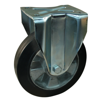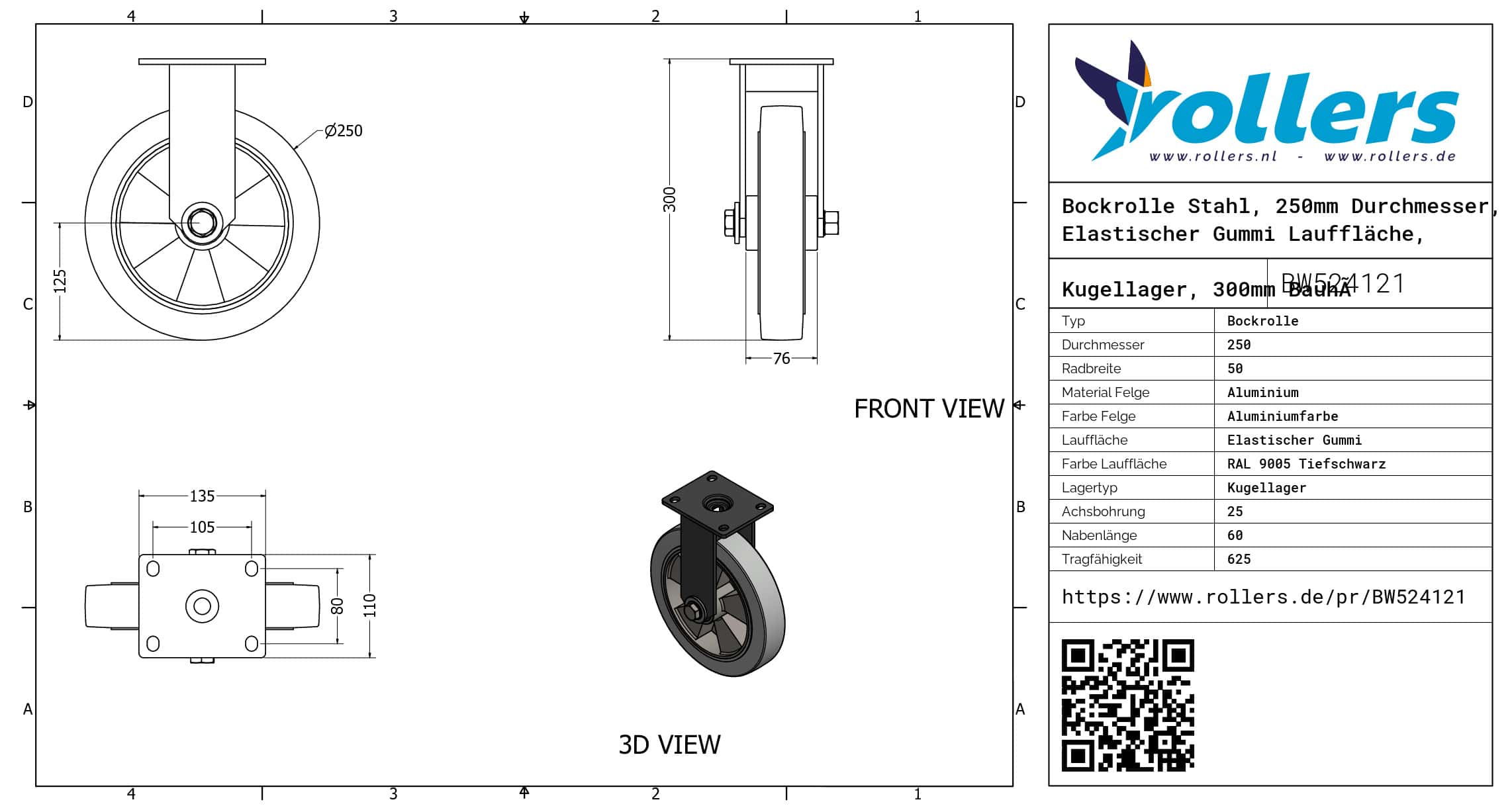 Diese Bockrolle hat eine Gabel aus Stahl. Die Bauhöhe beträgt 300 mm. Die Felge besteht aus Aluminium und die Lauffläche aus Elastischer Gummi (Farbe RAL 9005 Tiefschwarz). Das Rad hat einen Durchmesser von 250 mm und eine Breite von 50 mm. Die Nabenlänge beträgt 60 mm mit einem Achsloch von 25 mm. Die Bockrolle hat eine Tragfähigkeit von 625 kilogram. Das Rad hat ein Kugellager als Lagerung. Dieses Produkt finden Sie in unseren Kategorien: Gummiräder, Schwerlastbockrollen, Bockrollen 500 kg, Bockrollen 250 mm, Schwerlastrollen, Transportrollen, Bockrollen.