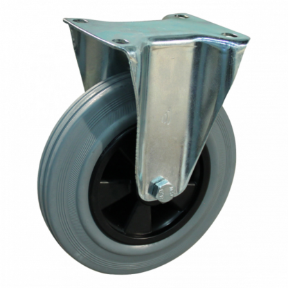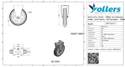 Diese Bockrolle hat eine Gabel aus Stahl. Die Rolle hat eine Bauhöhe von 290 mm. Die Felge besteht aus PP (Farbe RAL 9005 Tiefschwarz) und die Lauffläche aus Gummi (Farbe RAL 7001 Silbergrau). Das Rad hat einen Durchmesser von 250 mm und eine Breite von 60 mm. Die Nabenlänge beträgt 60 mm mit einem Achsloch von 12 mm. Die Tragfähigkeit beträgt 250 kilogram. Der Lagertyp: Rollenlager.