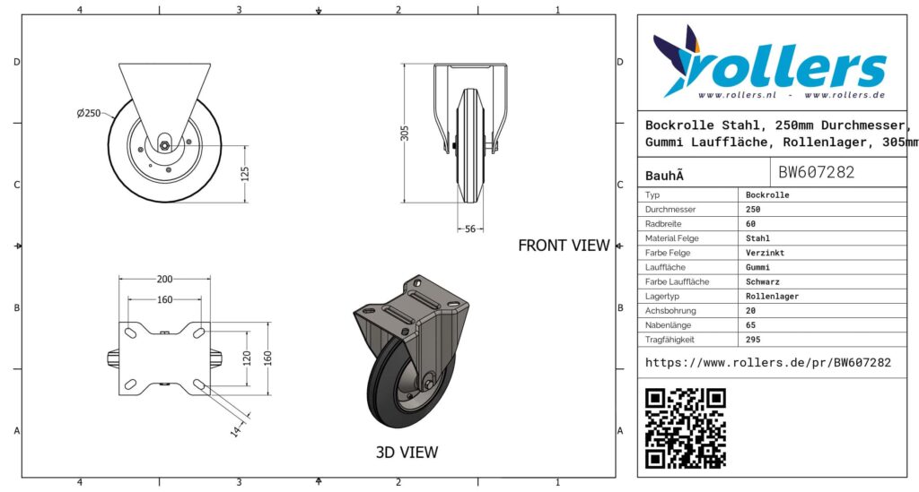 Dies ist eine Bockrolle mit einem Gabel aus Stahl. Die Bauhöhe beträgt 305 mm. Die Felge besteht aus Stahl (Farbe Verzinkt) und die Lauffläche aus Gummi (schwarz ist die Farbe). Das Rad hat einen Durchmesser von 250 mm und eine Breite von 60 mm. Die Nabenlänge beträgt 65 mm und die Achsbohrung hat einen Durchmesser von 20 mm. Die Rolle hat eine Tragfähigkeit von 295 kg. Der Lagertyp: Rollenlager.