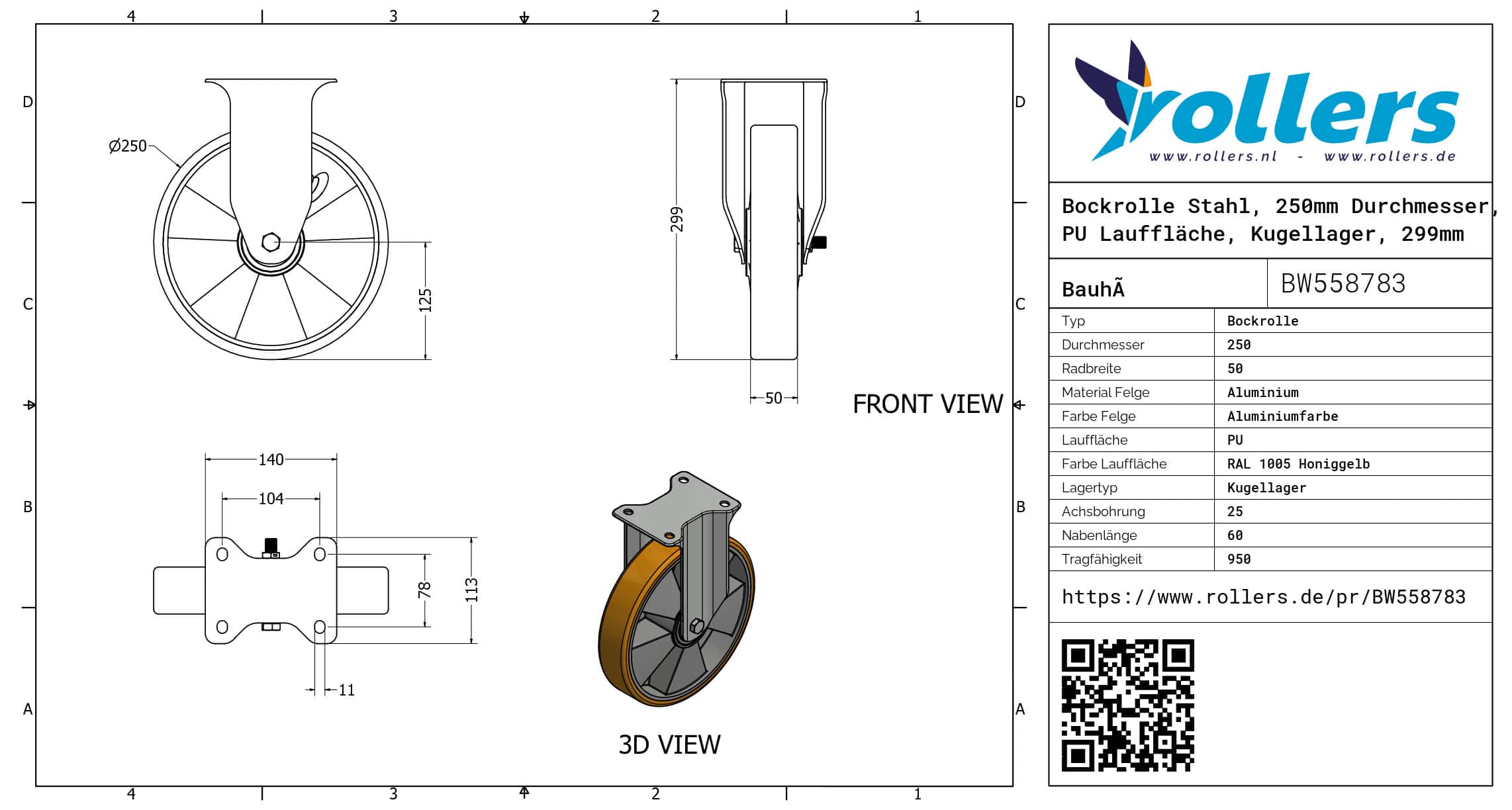 Dies ist eine Bockrolle aus Stahl. Die Bauhöhe ist 299 millimeter. Das Material der Felge ist Aluminium und der Lauffläche PU (Farbe RAL 1005 Honiggelb). Das Rad hat einen Durchmesser von 250 millimeter und eine Breite von 50 millimeter. Die Nabenlänge beträgt 60 millimeter und die Achsbohrung hat einen Durchmesser von 25 millimeter. Die Tragfähigkeit beträgt 950 kilogram. Der Lagertyp: Kugellager. Dieses Produkt finden Sie in unseren Kategorien: Schwerlastbockrollen, Bockrollen 800 kg, Bockrollen 250 mm, Schwerlastrollen, PU Rollen, Polyurethan Rollen, Transportrollen, Bockrollen.