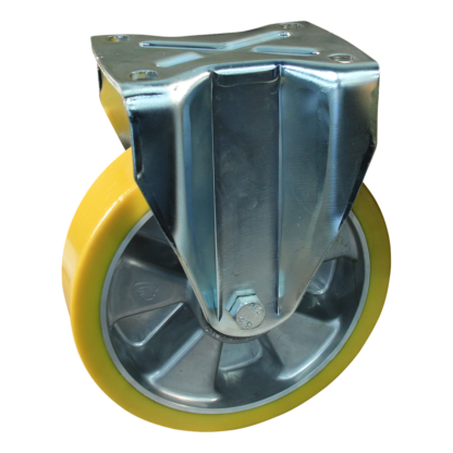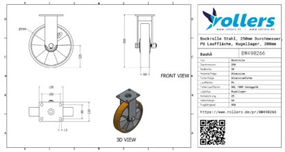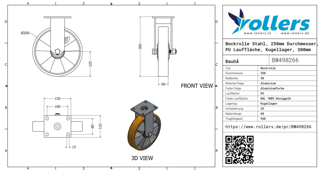 Dies ist eine Bockrolle mit einem Gabel aus Stahl. Die Bauhöhe ist 300 millimeter. Die Felge besteht aus Aluminium und die Lauffläche aus PU (Farbe RAL 1005 Honiggelb). Das Rad hat einen Durchmesser von 250 millimeter und eine Breite von 50 millimeter. Die Nabenlänge beträgt 60 millimeter mit einem Achsloch von 25 millimeter. Die Tragfähigkeit beträgt 950 kilo. Das Rad hat ein Kugellager als Lagerung. Rollers.de hat dieses Produkt in die folgenden Kategorien eingeteilt: Schwerlastbockrollen, Bockrollen 800 kg, Bockrollen 250 mm, Schwerlastrollen, PU Rollen, Polyurethan Rollen, Transportrollen, Bockrollen.