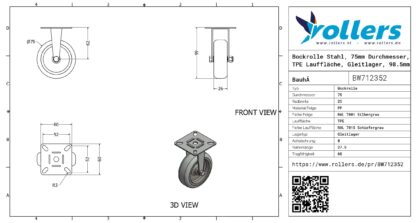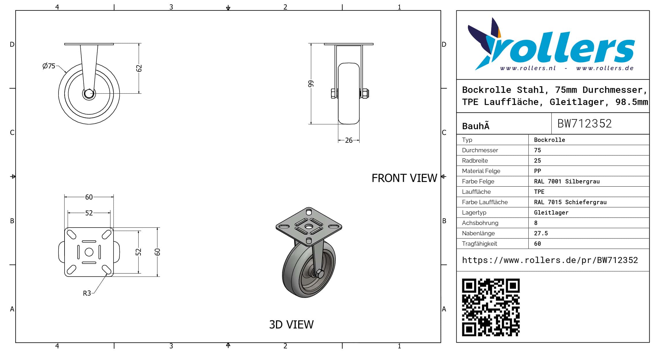 Dies ist eine Bockrolle aus Stahl. Die Bauhöhe beträgt 98.5 mm. Die Felge besteht aus PP (RAL 7001 Silbergrau) und die Lauffläche aus TPE (Farbe RAL 7015 Schiefergrau). Das Rad hat einen Durchmesser von 75 mm und eine Breite von 25 mm. Die Nabenlänge beträgt 27.5 mm mit einem Achsloch von 8 mm. Die Tragfähigkeit beträgt 60 kilogram. Das Rad hat ein Gleitlager als Lagerung. Dieses Produkt ist in unserem Shop in folgenden Kategorien erhältlich: Kleine Bockrollen, Bockrollen 50 kg, Bockrollen 75 mm, Bockrollen. Marke: Novio.