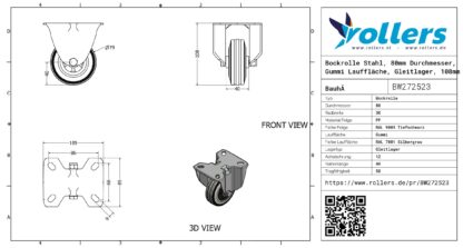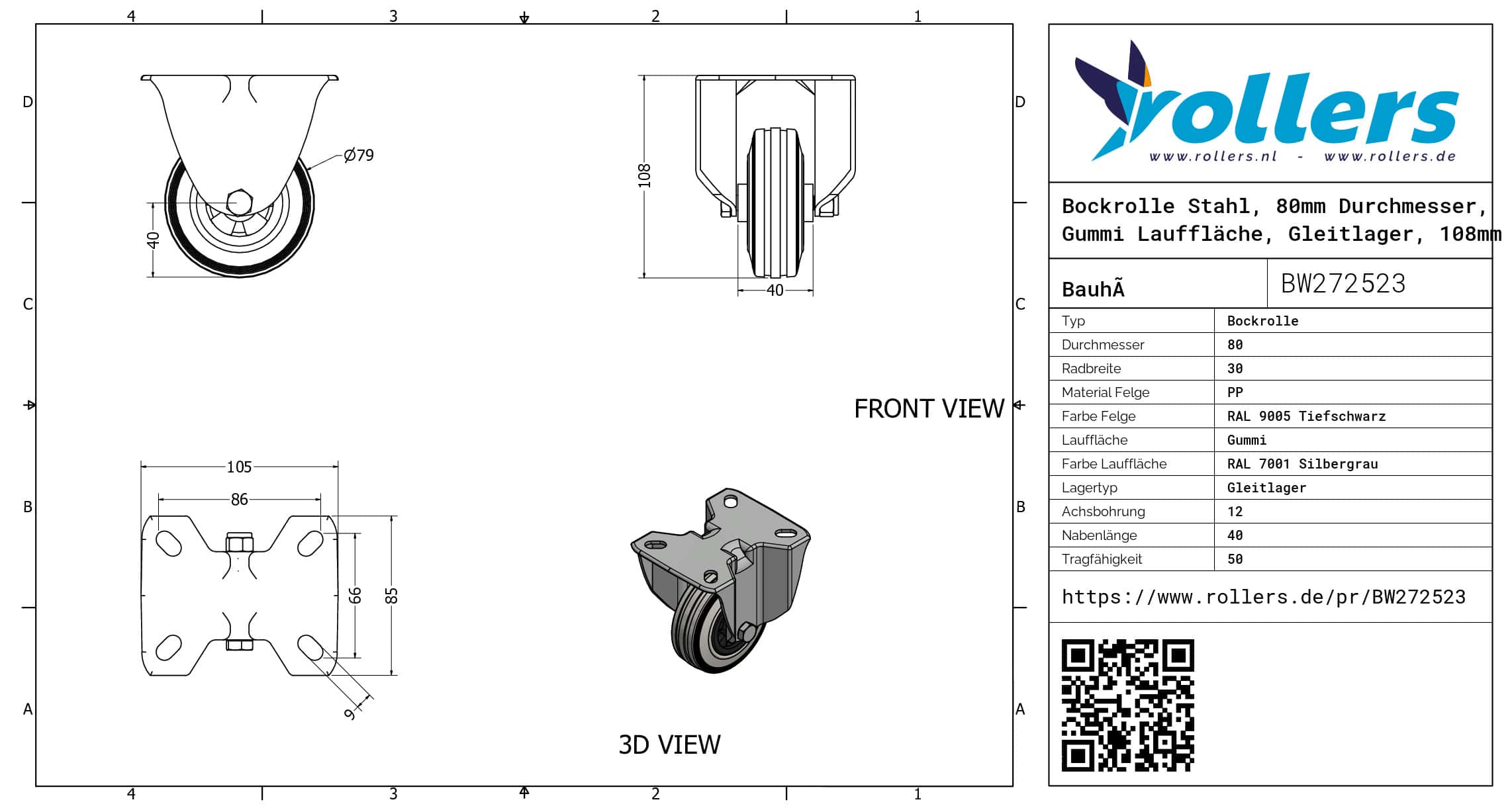 Dies ist eine Bockrolle aus Stahl. Die Rolle hat eine Bauhöhe von 108 mm. Die Felge besteht aus PP (Farbe RAL 9005 Tiefschwarz) und die Lauffläche aus Gummi (RAL 7001 Silbergrau ist die Farbe). Das Rad hat einen Durchmesser von 80 mm und eine Breite von 30 mm. Die Nabenlänge beträgt 40 mm mit einem Achsloch von 12 mm. Die Tragfähigkeit beträgt 50 kg. Der Lagertyp: Gleitlager. Dieses Produkt finden Sie in unseren Kategorien: Gummiräder, Kleine Bockrollen, Bockrollen 50 kg, Bockrollen 80 mm, Transportrollen, Bockrollen.