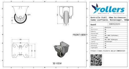 Bockrolle Stahl, 80mm Durchmesser, Gummi Lauffläche, Rollenlager, 108mm Bauhöhe