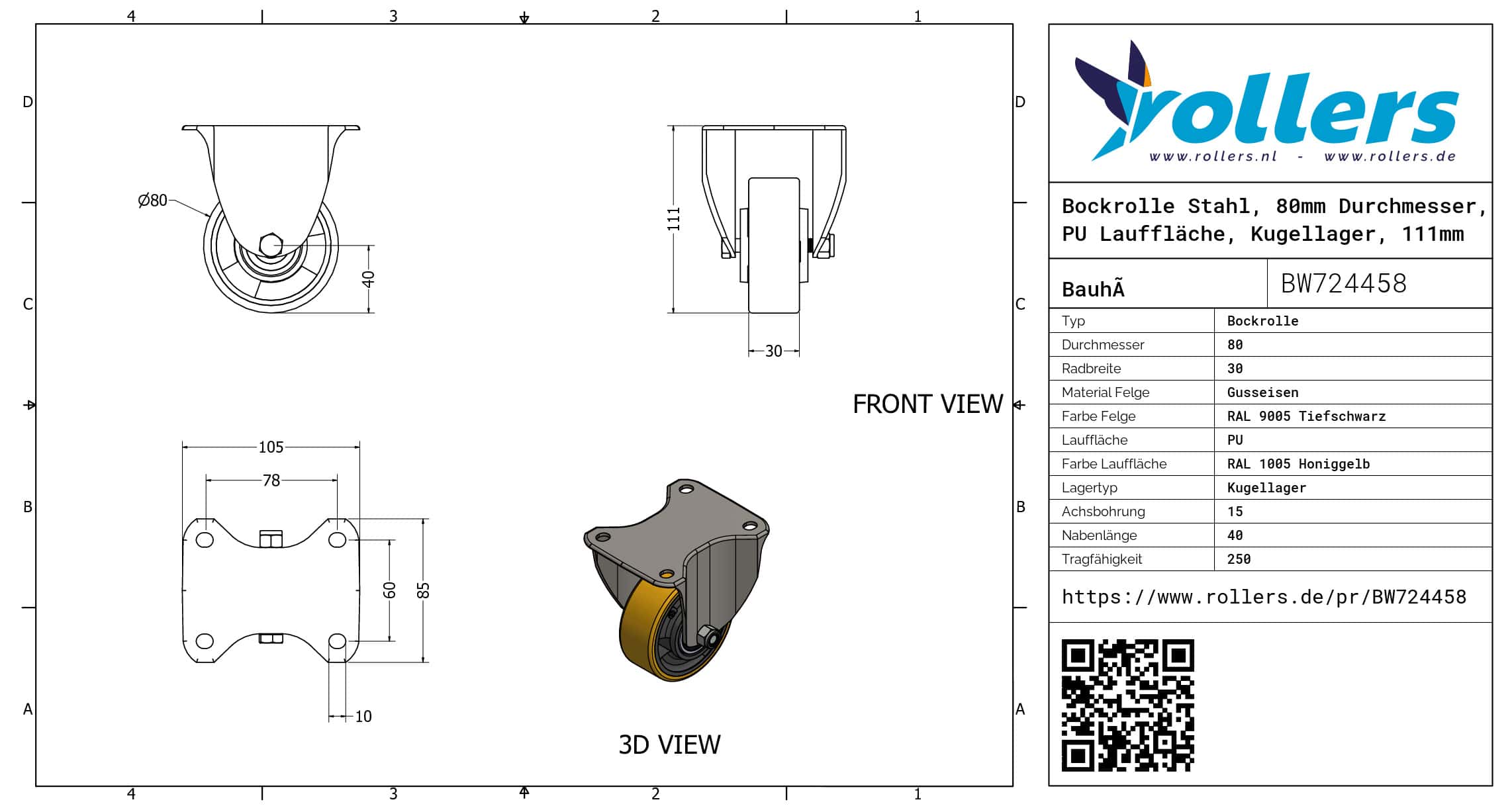 Dies ist eine Bockrolle aus Stahl. Die Bauhöhe ist 111 mm. Die Felge besteht aus Gusseisen (Farbe RAL 9005 Tiefschwarz) und die Lauffläche aus PU (Farbe RAL 1005 Honiggelb). Das Rad hat einen Durchmesser von 80 mm und eine Breite von 30 mm. Die Nabenlänge beträgt 40 mm mit einem Achsloch von 15 mm. Die Tragfähigkeit beträgt 250 kilo. Das Rad hat ein Kugellager als Lagerung. Dieses Produkt ist in unserem Shop in folgenden Kategorien erhältlich: Kleine Bockrollen, Rollbehälter Rollen, Müllcontainer Rollen, Bockrollen 200 kg, Bockrollen 80 mm, PU Rollen, Polyurethan Rollen, Transportrollen, Bockrollen.