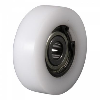 Die Lauffläche dieser Führungsrolle besteht aus POM (Polyoxymethylen). POM ist sehr verschleißfest, formbeständig und weist einen geringen Reibungswiderstand auf. Außerdem absorbiert es Vibrationen und Stöße sehr gut. Shore-Härte D: 70. Das Rad hat einen Durchmesser von 50 mm und eine Breite von 15 mm. Die Nabenlänge beträgt 9 mm mit einem Achsloch von 10 mm. Die Tragfähigkeit beträgt 100 kilo. Das Rad hat ein Rollenlager als Lagerung.
