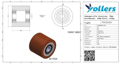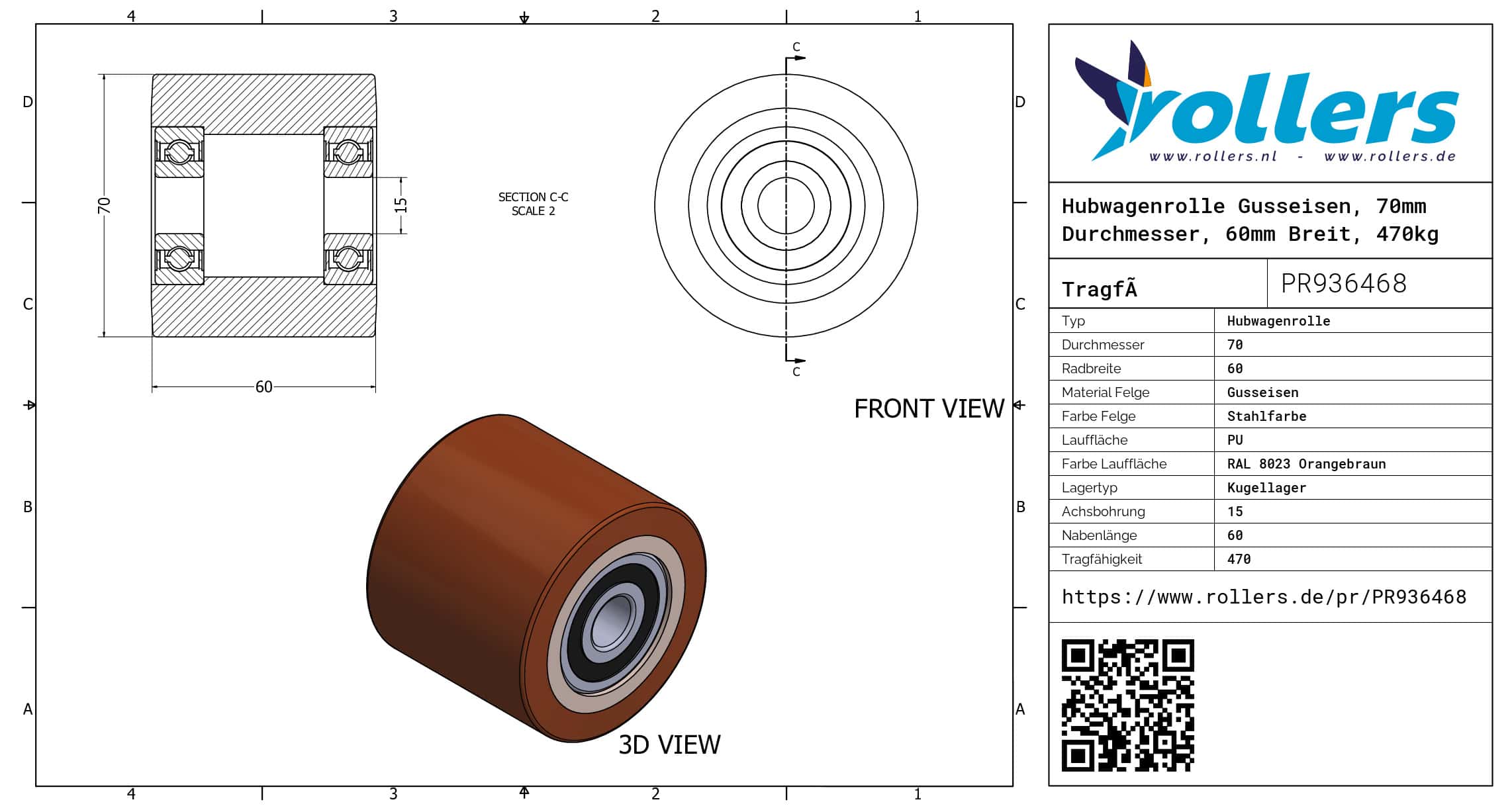 Dies ist eine einzelne Hubwagenrolle aus Gusseisen. Das Material der Felge ist Gusseisen (Farbe Stahlfarbe) und der Lauffläche PU (RAL 8023 Orangebraun ist die Farbe). Das Rad hat einen Durchmesser von 70 millimeter und eine Breite von 60 millimeter. Die Nabenlänge beträgt 60 millimeter mit einem Achsloch von 15 millimeter. Die Hubwagenrolle hat eine Tragfähigkeit von 470 kg. Der Lagertyp: Kugellager. Dieses Produkt finden Sie in unseren Kategorien: Hubwagenrollen 250 kg, Hubwagenrollen 70 mm, Hubwagenrollen.