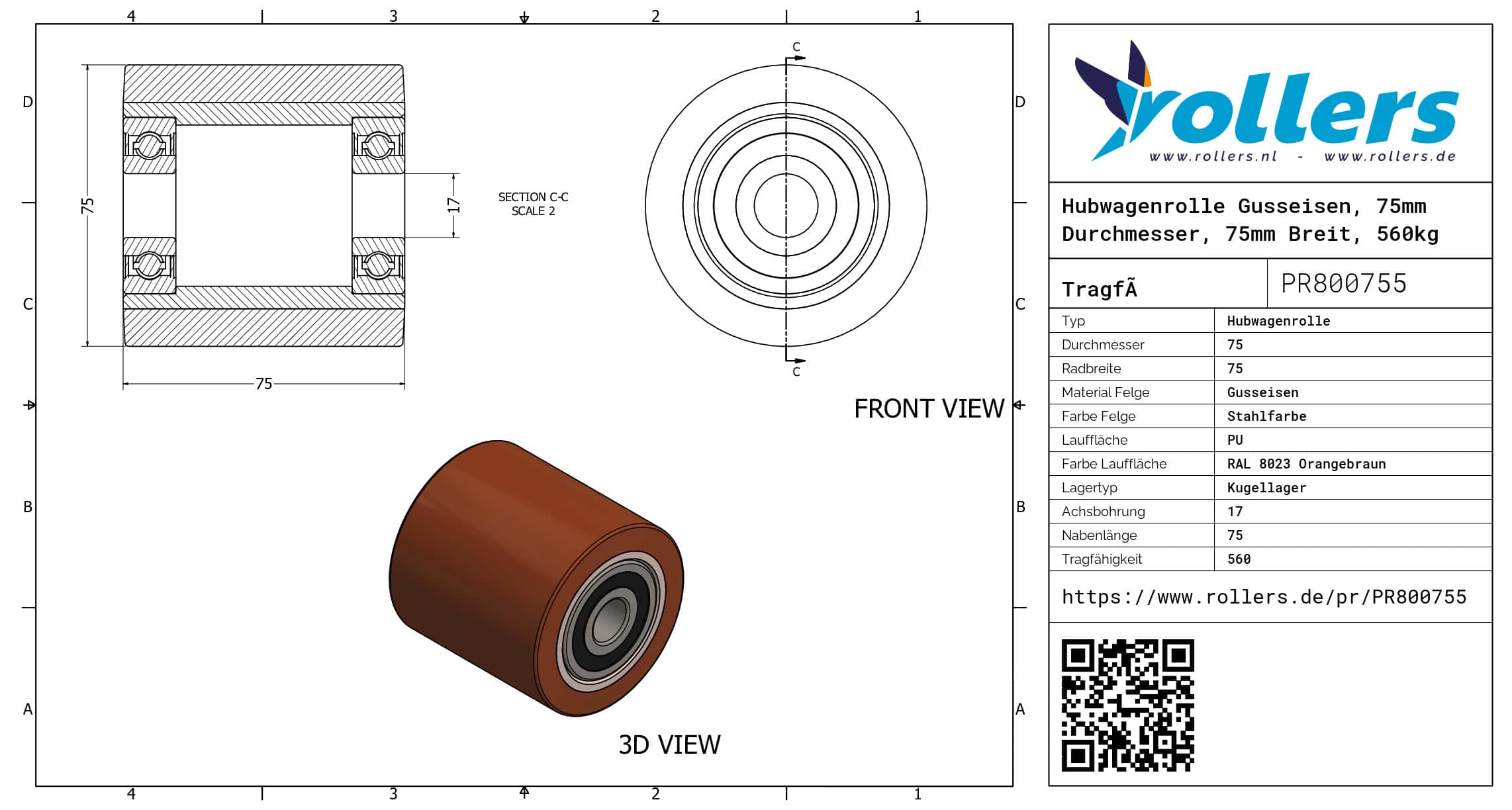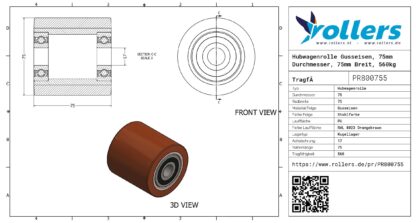 Dies ist eine einzelne Hubwagenrolle aus Gusseisen. Die Felge besteht aus Gusseisen (Stahlfarbe) und die Lauffläche aus PU (RAL 8023 Orangebraun). Das Rad hat einen Durchmesser von 75 mm und eine Breite von 75 mm. Die Nabenlänge beträgt 75 mm und die Achsbohrung hat einen Durchmesser von 17 mm. Das Rad hat eine Tragfähigkeit von 560 kilo. Der Lagertyp: Kugellager. Dieses Produkt finden Sie in unseren Kategorien: Hubwagenrollen 500 kg, Hubwagenrollen 75 mm, Hubwagenrollen.