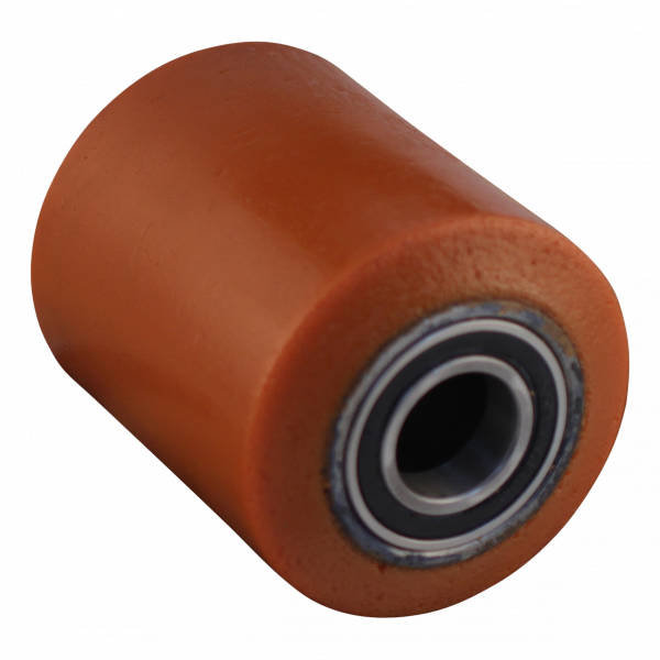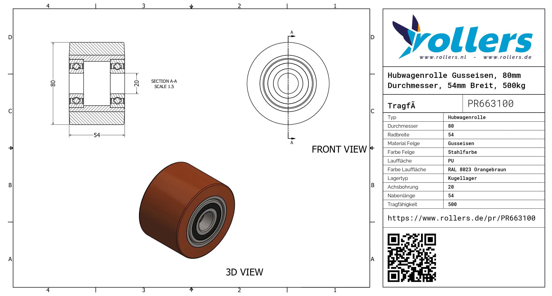 Dies ist eine einzelne Hubwagenrolle aus Gusseisen. Das Material der Felge ist Gusseisen (Stahlfarbe) und der Lauffläche PU (Farbe RAL 8023 Orangebraun). Das Rad hat einen Durchmesser von 80 mm und eine Breite von 54 mm. Die Nabenlänge beträgt 54 mm und die Achsbohrung hat einen Durchmesser von 20 mm. Die Tragfähigkeit beträgt 500 kilo. Der Lagertyp: Kugellager.