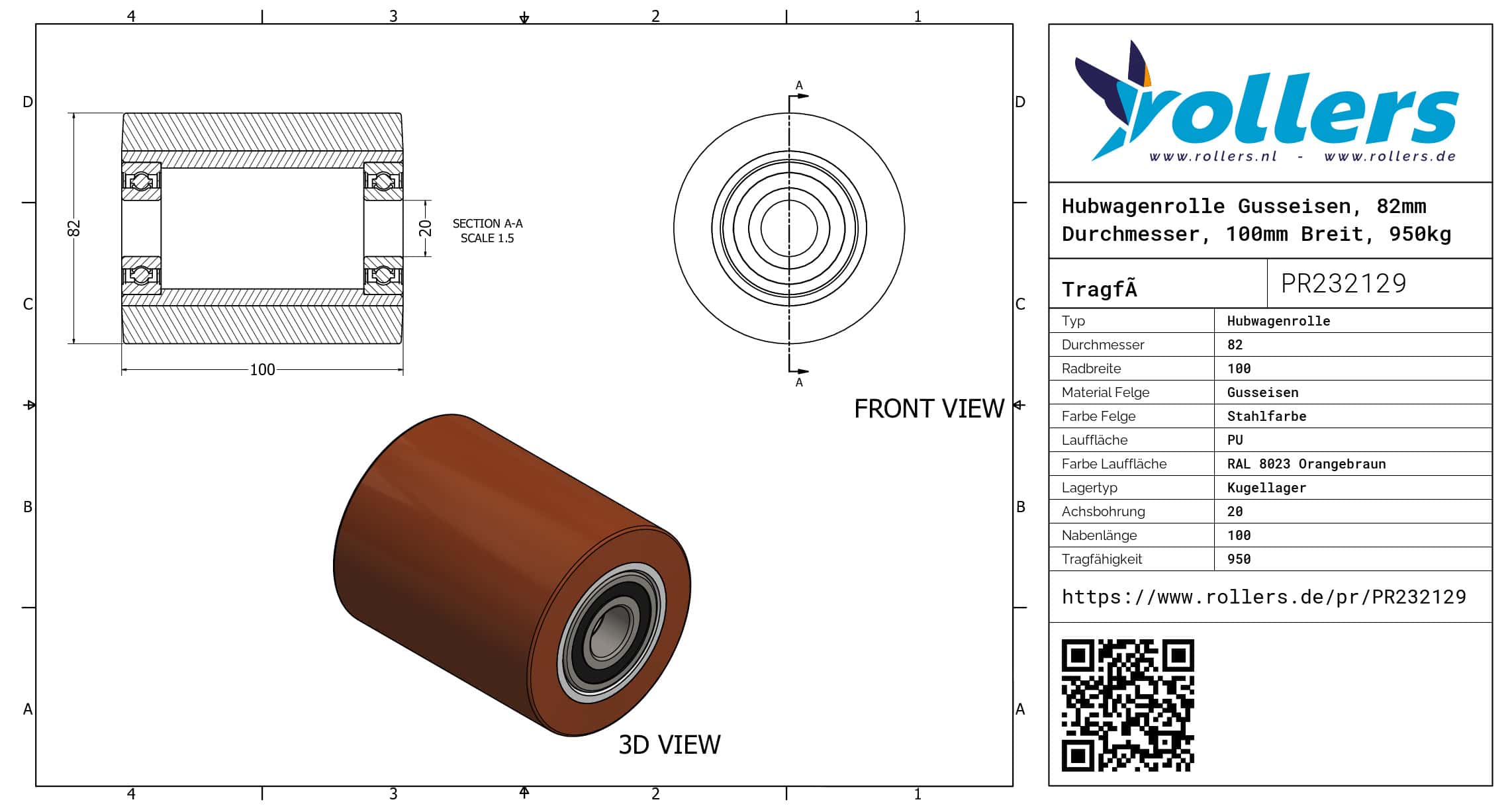 Dies ist eine einzelne Hubwagenrolle aus Gusseisen. Die Felge besteht aus Gusseisen (Stahlfarbe ist die Farbe) und die Lauffläche aus PU (RAL 8023 Orangebraun). Das Rad hat einen Durchmesser von 82 mm und eine Breite von 100 mm. Die Nabenlänge beträgt 100 mm und die Achsbohrung hat einen Durchmesser von 20 mm. Die Tragfähigkeit beträgt 950 kilogram. Der Lagertyp: Kugellager. Dieses Produkt finden Sie in unseren Kategorien: Hubwagenrollen 750 kg, Hubwagenrollen 82 mm, Hubwagenrollen.