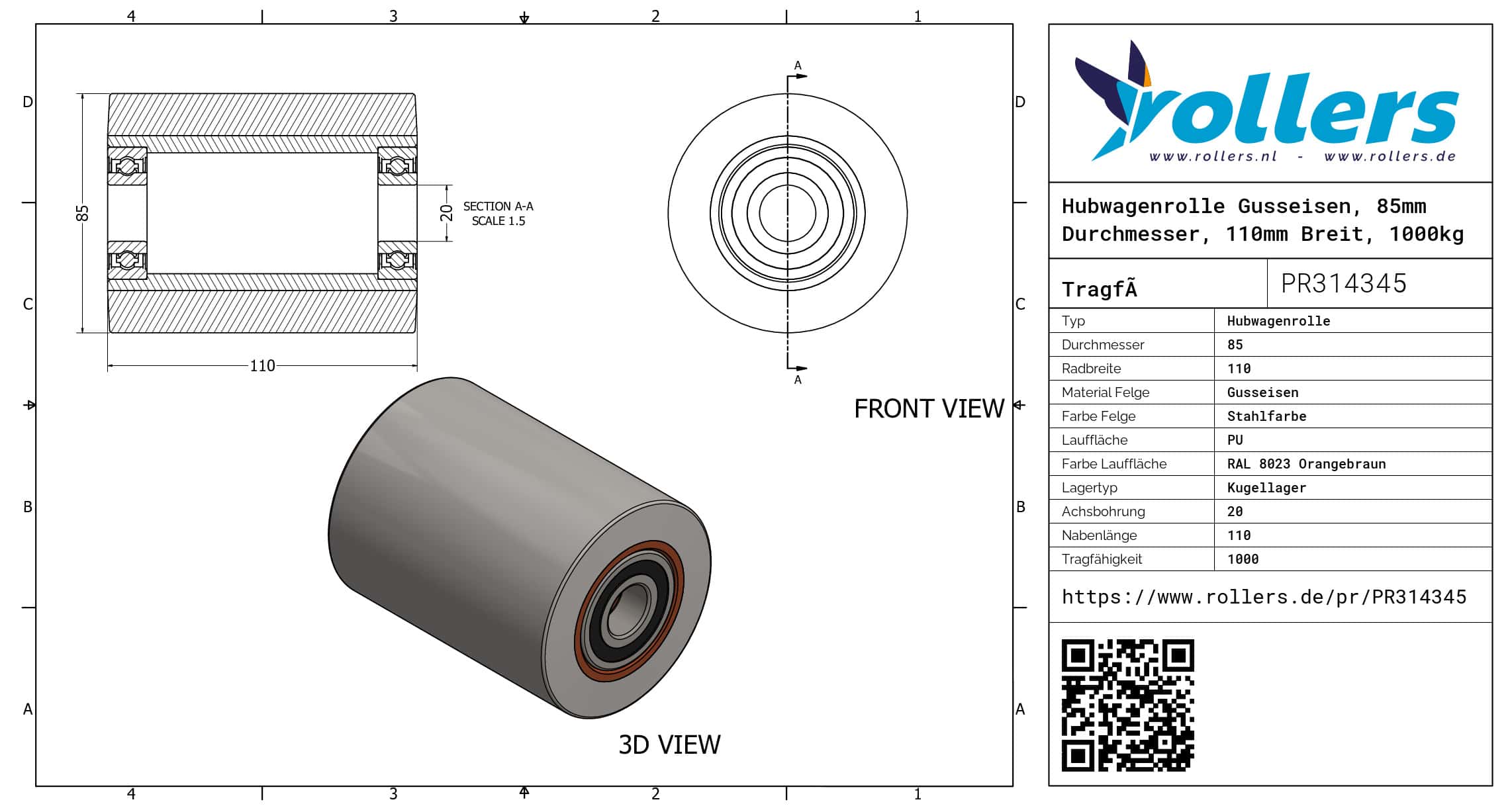 Dies ist eine einzelne Hubwagenrolle aus Gusseisen. Die Felge besteht aus Gusseisen (Stahlfarbe) und die Lauffläche aus PU (RAL 8023 Orangebraun ist die Farbe). Das Rad hat einen Durchmesser von 85 mm und eine Breite von 110 mm. Die Nabenlänge beträgt 110 mm mit einem Achsloch von 20 mm. Das Rad hat eine Tragfähigkeit von 1000 kilo. Der Lagertyp: Kugellager. Dieses Produkt finden Sie in unseren Kategorien: Hubwagenrollen 1000 kg, Hubwagenrollen 85 mm, Hubwagenrollen.