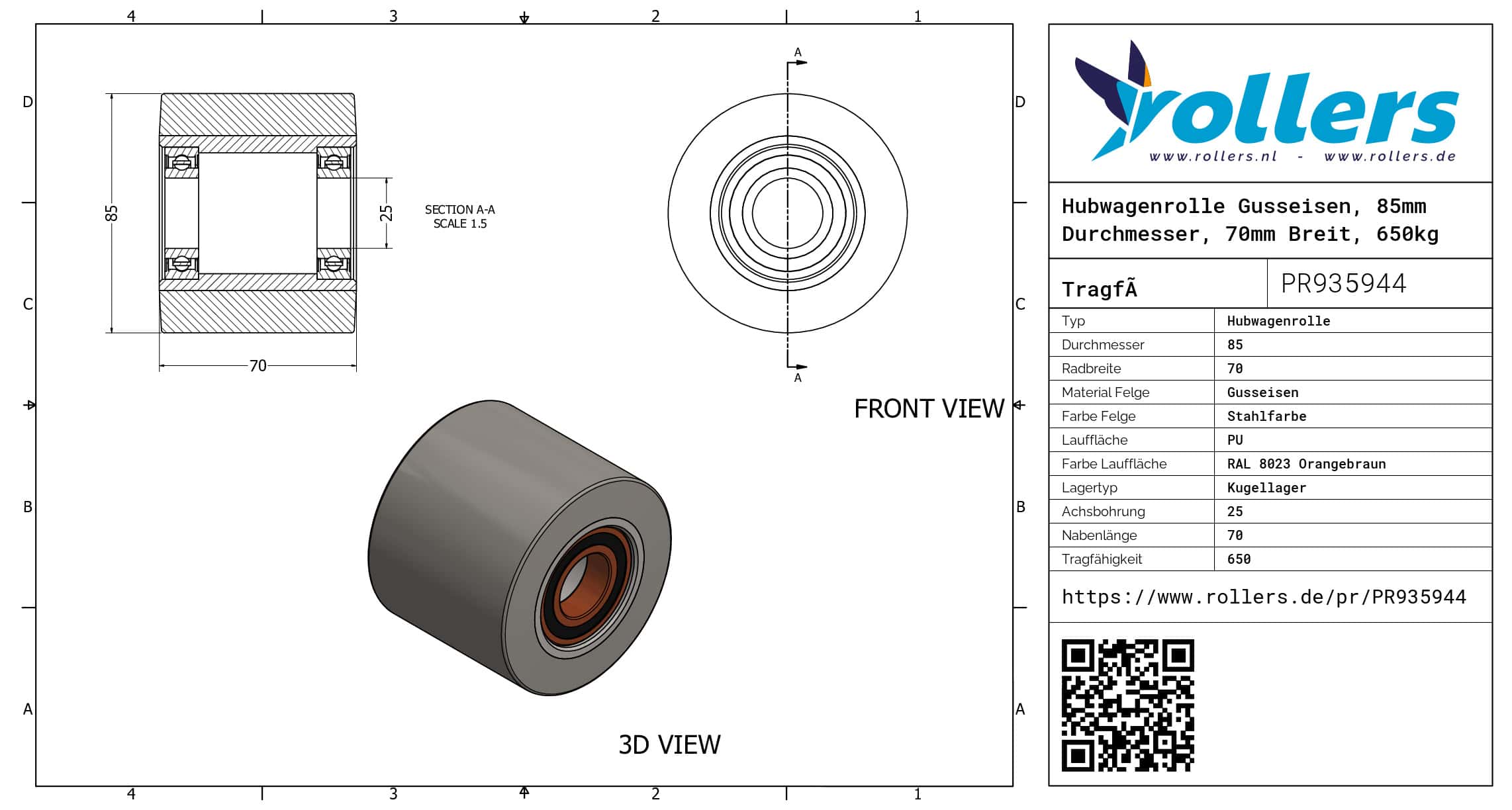 Dies ist eine einzelne Hubwagenrolle aus Gusseisen. Das Material der Felge ist Gusseisen (Farbe Stahlfarbe) und der Lauffläche PU (RAL 8023 Orangebraun). Das Rad hat einen Durchmesser von 85 mm und eine Breite von 70 mm. Die Nabenlänge beträgt 70 mm mit einem Achsloch von 25 mm. Die Tragfähigkeit beträgt 650 kilogram. Der Lagertyp: Kugellager. Dieses Produkt ist in unserem Shop in folgenden Kategorien erhältlich: Hubwagenrollen 500 kg, Hubwagenrollen 85 mm, Hubwagenrollen.