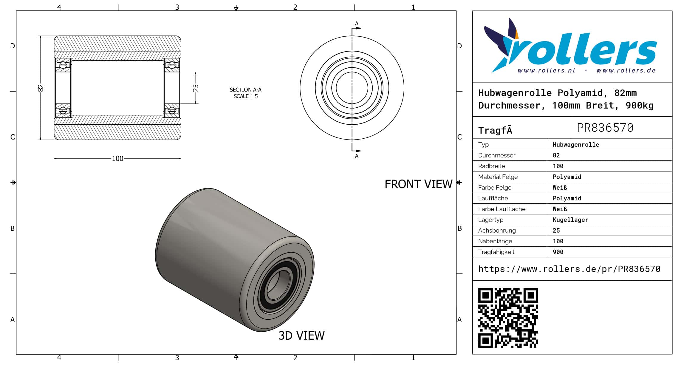 Dies ist eine einzelne Hubwagenrolle aus Polyamid. Das ganze Rad besteht aus Polyamid (Farbe weiß). Das Rad hat einen Durchmesser von 82 mm und eine Breite von 100 mm. Die Nabenlänge beträgt 100 mm mit einem Achsloch von 25 mm. Die Hubwagenrolle hat eine Tragfähigkeit von 900 kilogram. Das Rad hat ein Kugellager als Lagerung. Dieses Produkt finden Sie in unseren Kategorien: Hubwagenrollen 750 kg, Hubwagenrollen 82 mm, Hubwagenrollen.