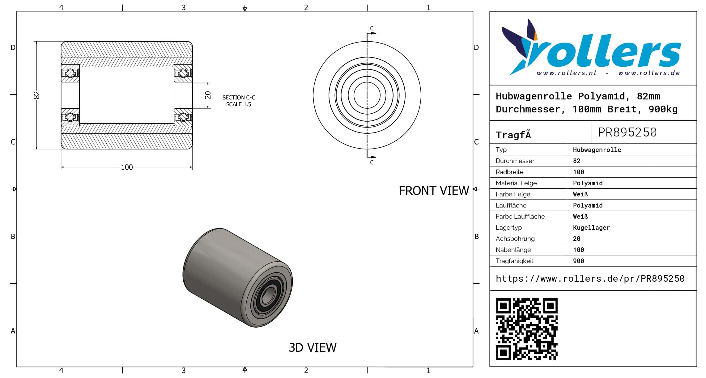 Dies ist eine einzelne Hubwagenrolle aus Polyamid. Das Rad besteht vollständig aus Polyamid (weiß). Das Rad hat einen Durchmesser von 82 millimeter und eine Breite von 100 millimeter. Die Nabenlänge beträgt 100 millimeter und die Achsbohrung hat einen Durchmesser von 20 millimeter. Das Rad hat eine Tragfähigkeit von 900 kg. Das Rad hat ein Kugellager als Lagerung. Dieses Produkt ist in unserem Shop in folgenden Kategorien erhältlich: Hubwagenrollen 750 kg, Hubwagenrollen 82 mm, Hubwagenrollen.