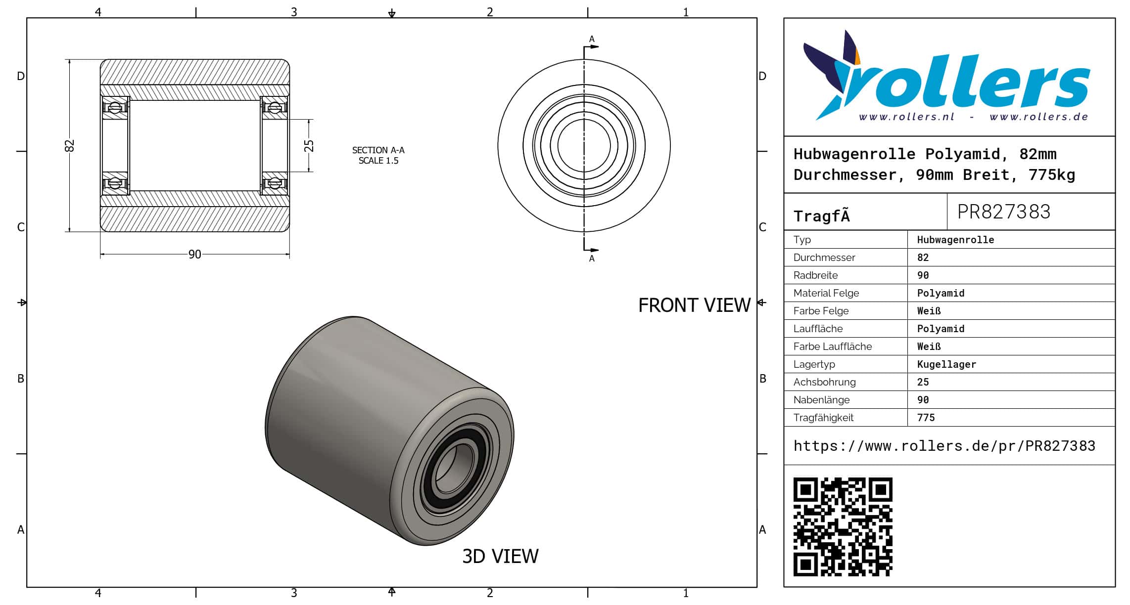 Dies ist eine einzelne Hubwagenrolle aus Polyamid. Die Felge besteht aus Polyamid (weiß) und die Lauffläche aus Polyamid (weiß ist die Farbe). Das Rad hat einen Durchmesser von 82 millimeter und eine Breite von 90 millimeter. Die Nabenlänge beträgt 90 millimeter und die Achsbohrung hat einen Durchmesser von 25 millimeter. Die Tragfähigkeit beträgt 775 kilo. Der Lagertyp: Kugellager. Rollers.de hat dieses Produkt in die folgenden Kategorien eingeteilt: Hubwagenrollen 750 kg, Hubwagenrollen 82 mm, Hubwagenrollen.