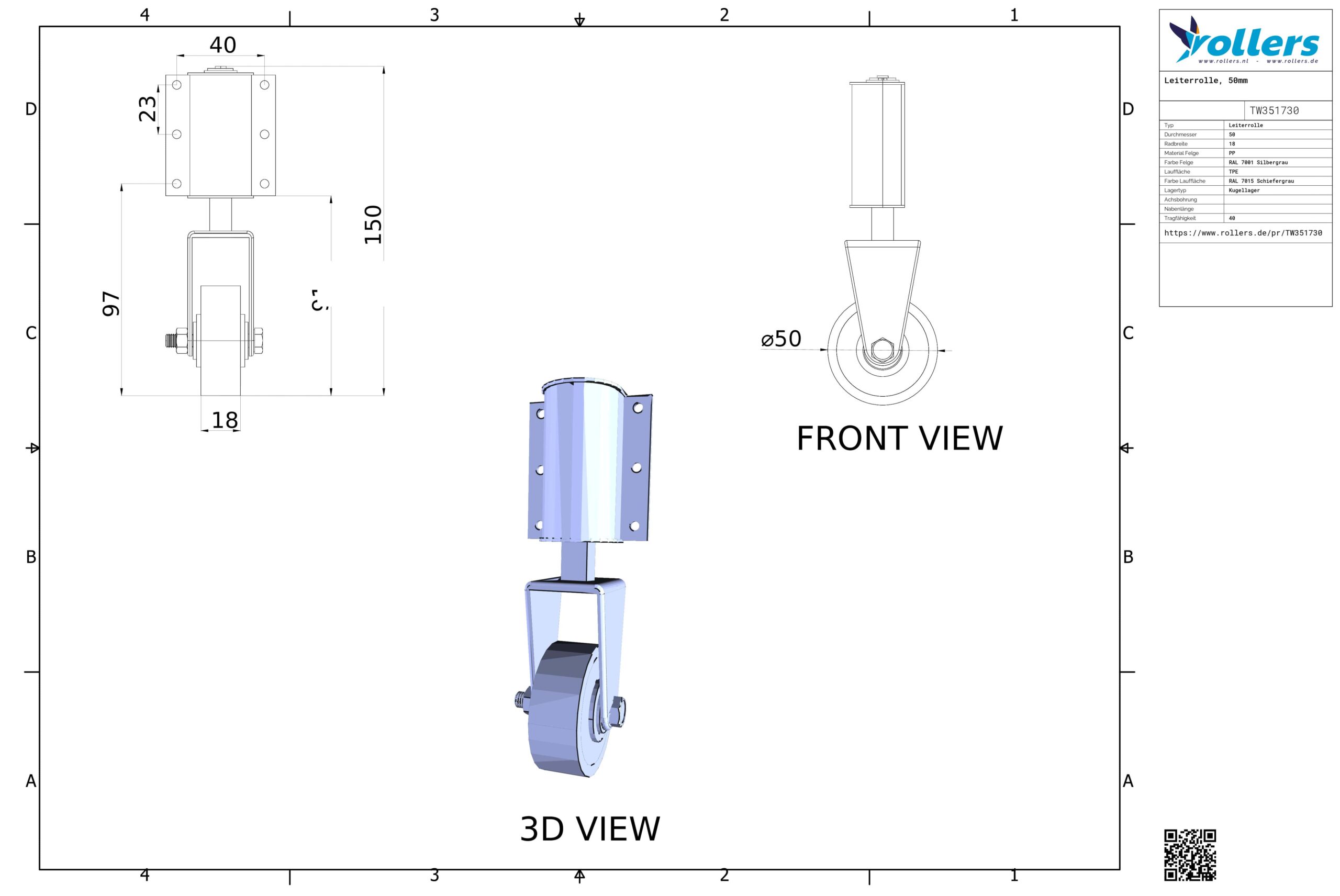 Eine Leiterrolle ist eine gefederte Rolle, die unter eine fahrbare Leiter/Treppe montiert werden kann. Wenn genügend Druck (> 5 Kg) von oben ausgeübt wird (wenn jemand auf der Leiter steht), federt die Rolle ein. Es ist also eine Sicherheitseinrichtung, die dafür sorgt, dass die Leiter nicht wegfährt, wenn jemand auf der Leiter steht. Eine Leiterrolle kann auch als Torlaufrolle verwendet werden, um ein nicht zu schweres Tor zu unterstützen. Dies ist eine Bockrolle. Das Rad kann auf zwei Arten im Vierkantrohr befestigt werden. Der Federweg beträgt ca. 20 mm. Bei einer Belastung von mehr als 5 kg pro Rolle federt die Rolle ein.