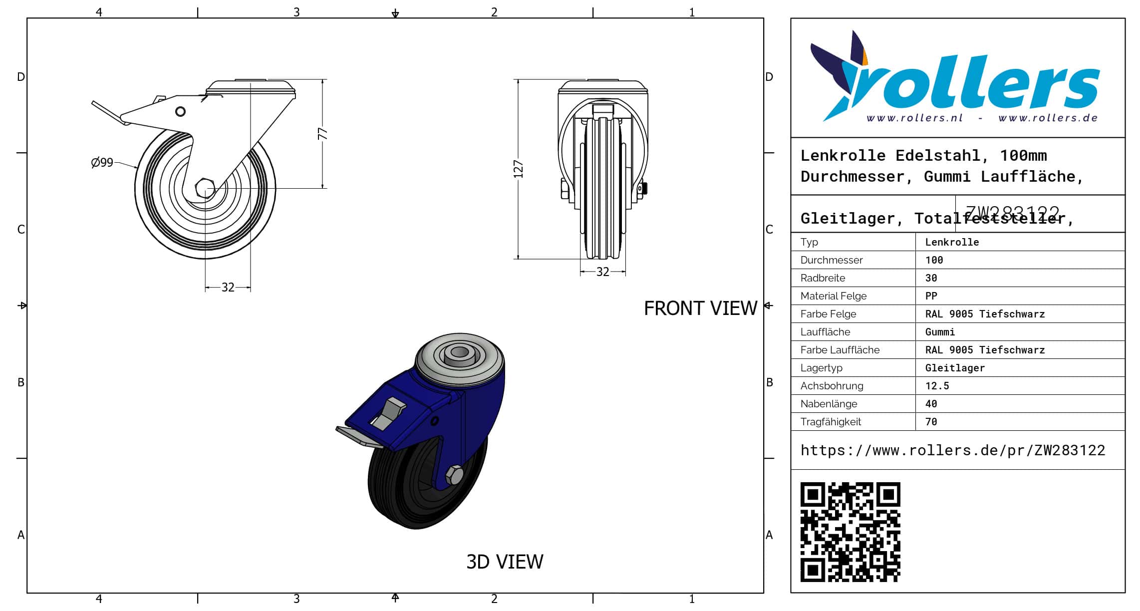 Lenkrolle Edelstahl, 100mm Durchmesser, Gummi Lauffläche, Gleitlager, Totalfeststeller, Nachlauf