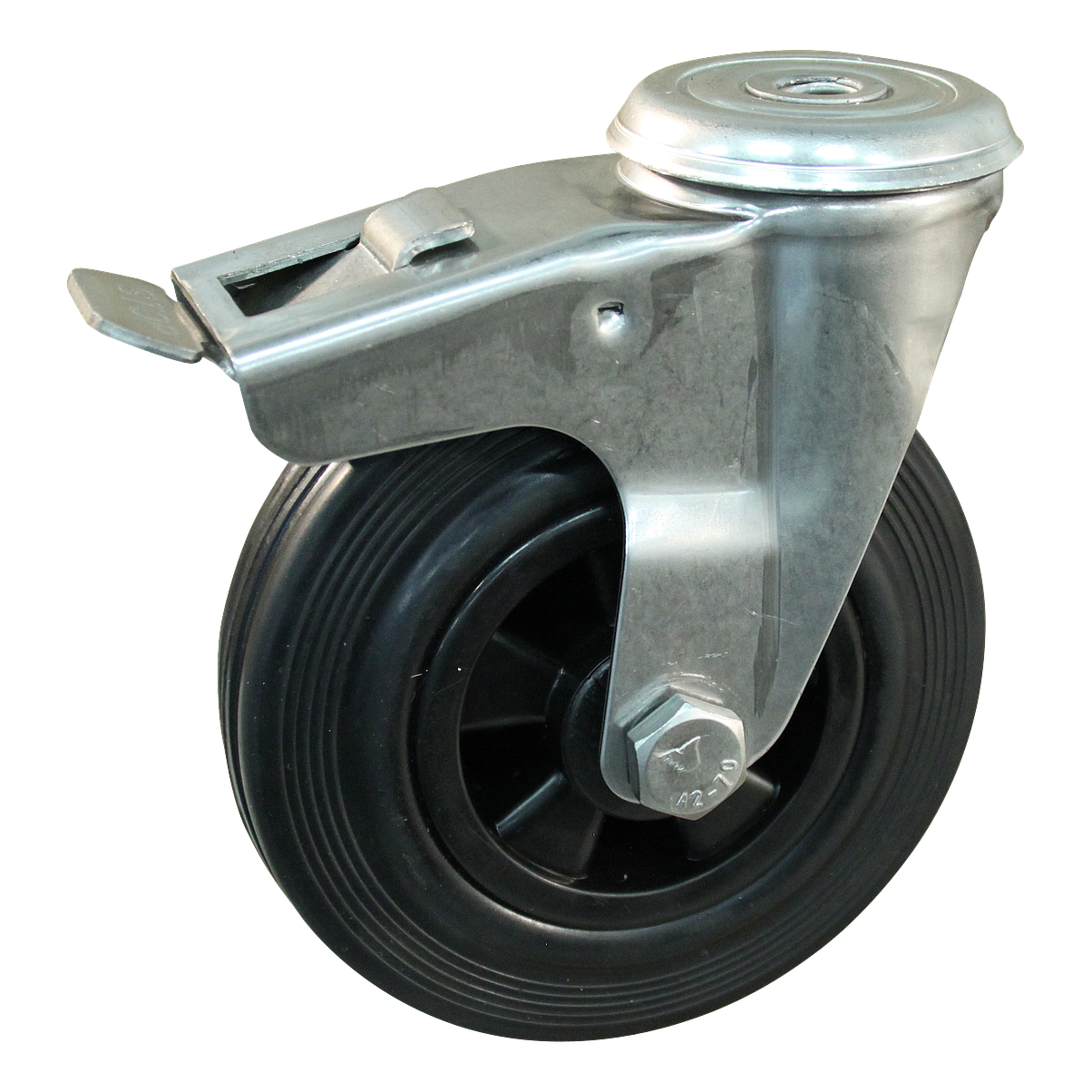 Lenkrolle Edelstahl, 100mm Durchmesser, Gummi Lauffläche, Rollenlager Edelstahl, Totalfeststeller, Nachlauf