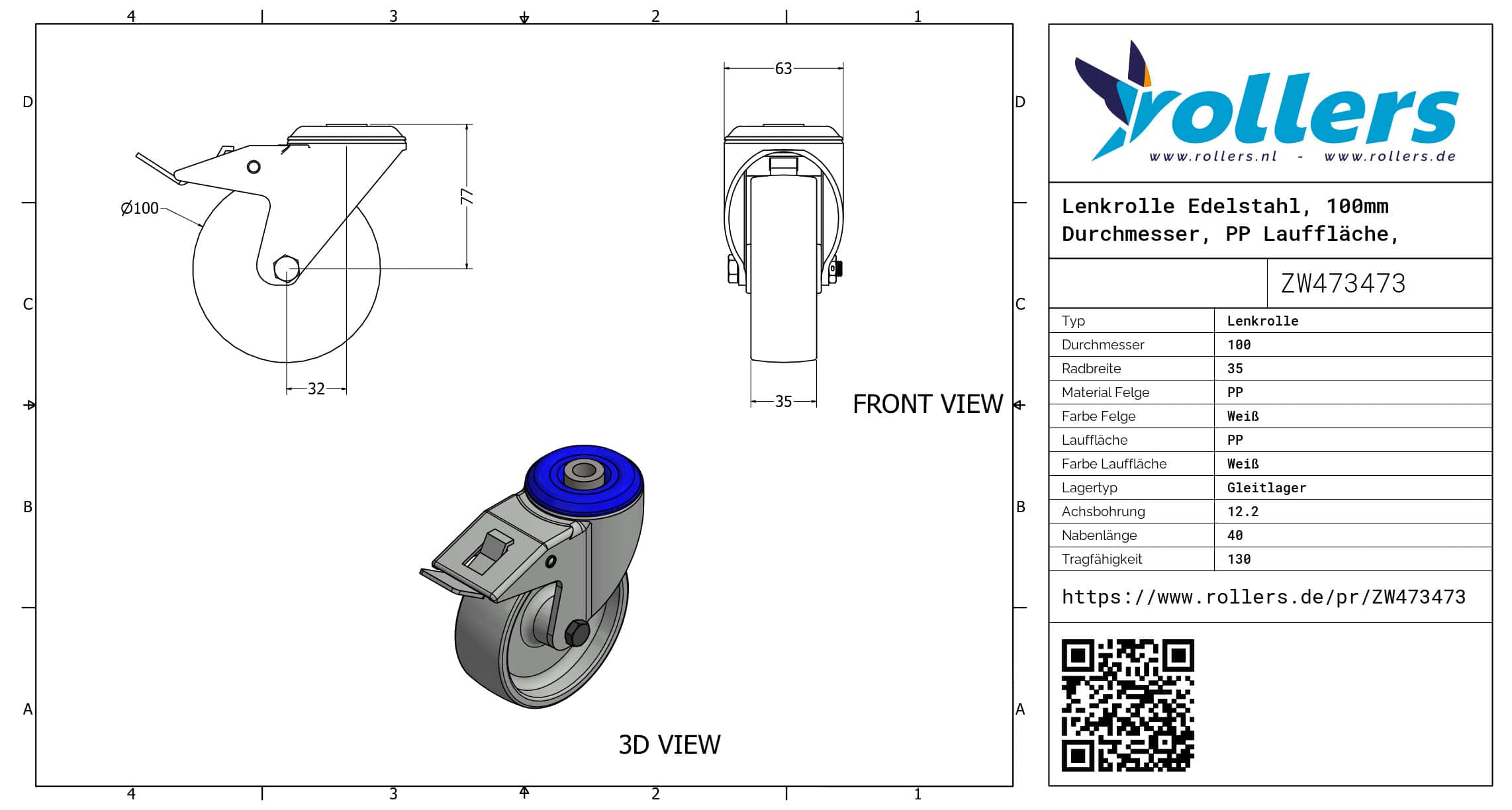 Lenkrolle Edelstahl, 100mm Durchmesser, PP Lauffläche, Gleitlager