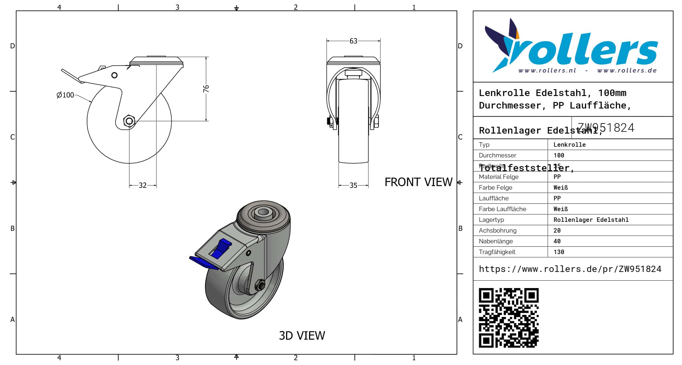 Dies ist eine Lenkrolle mit einem Gabel aus Edelstahl. Die Bremse ist vom Typ: Totalfeststeller, Nachlauf. Dies kann mit Befestigingsart „Bolzenloch“ befestigt werden. Die Rolle hat eine Bauhöhe von 127 millimeter. Das Rad besteht vollständig aus PP (Farbe weiß). Das Rad hat einen Durchmesser von 100 millimeter und eine Breite von 35 millimeter. Die Nabenlänge beträgt 40 millimeter mit einem Achsloch von 20 millimeter. Die Tragfähigkeit beträgt 130 kg. Der Lagertyp: Rollenlager Edelstahl. Dieses Produkt ist in unserem Shop in folgenden Kategorien erhältlich: Lenkrolle Edelstahl, Lenkrollen 100 kg, Lenkrollen 100 mm, Transportrollen, Lenkrollen mit Bremse, Lenkrollen.