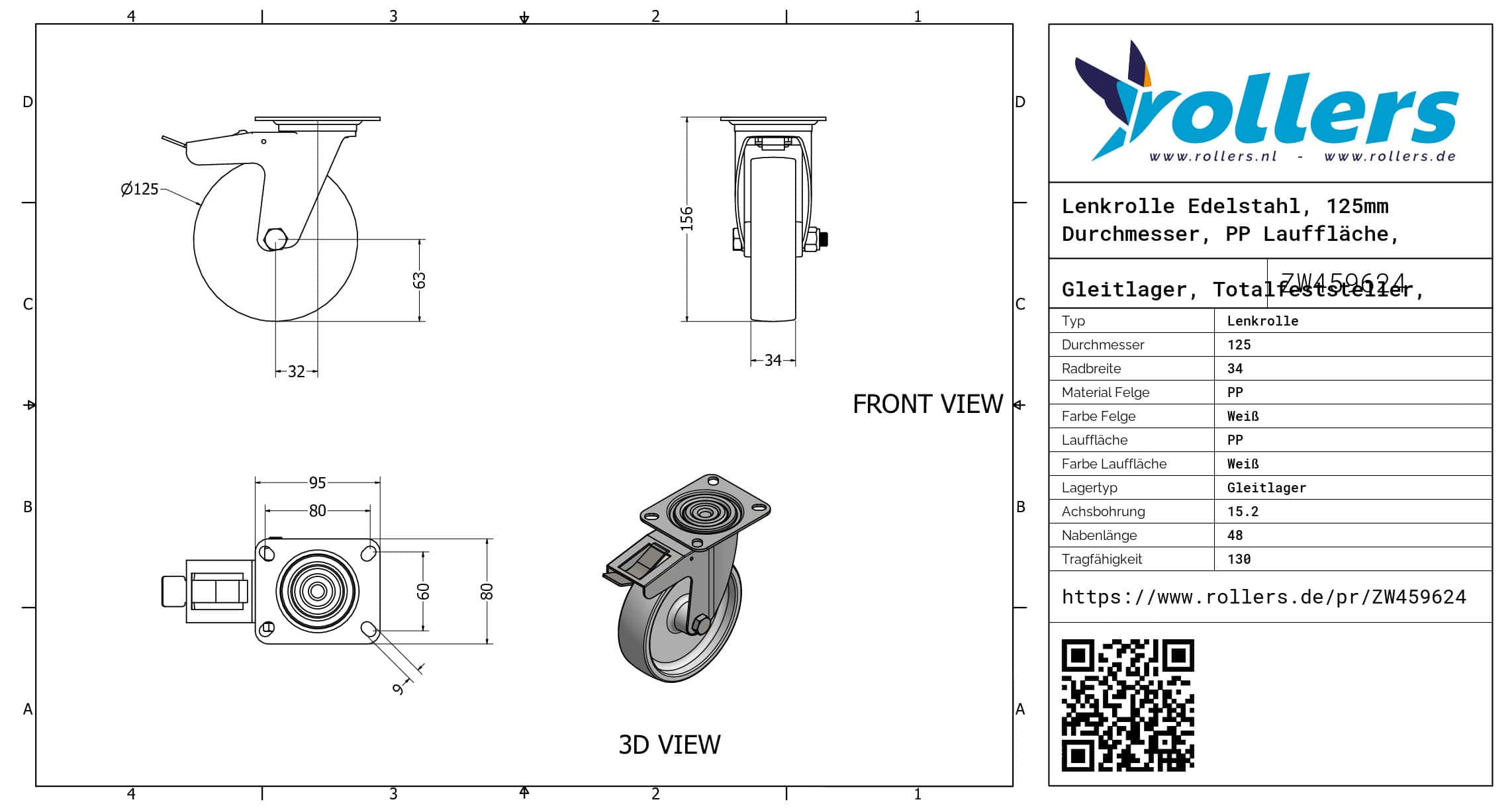 Diese Lenkrolle hat eine Gabel aus Edelstahl. Die Rolle hat eine Bremse des Typs Totalfeststeller, Nachlauf. Die Lenkrolle hat die folgende Befestigungsart: Platte. Die Rolle hat eine Bauhöhe von 155 millimeter. Die Felge besteht aus PP (Farbe weiß) und die Lauffläche aus PP (weiß). Das Rad hat einen Durchmesser von 125 millimeter und eine Breite von 34 millimeter. Die Nabenlänge beträgt 48 millimeter und die Achsbohrung hat einen Durchmesser von 15.2 millimeter. Die Tragfähigkeit beträgt 130 kg. Das Rad hat ein Gleitlager als Lagerung. Dieses Produkt ist in unserem Shop in folgenden Kategorien erhältlich: Lenkrolle Edelstahl, Lenkrollen 125 mm, Lenkrollen 100 kg, Transportrollen, Lenkrollen mit Bremse, Lenkrollen.