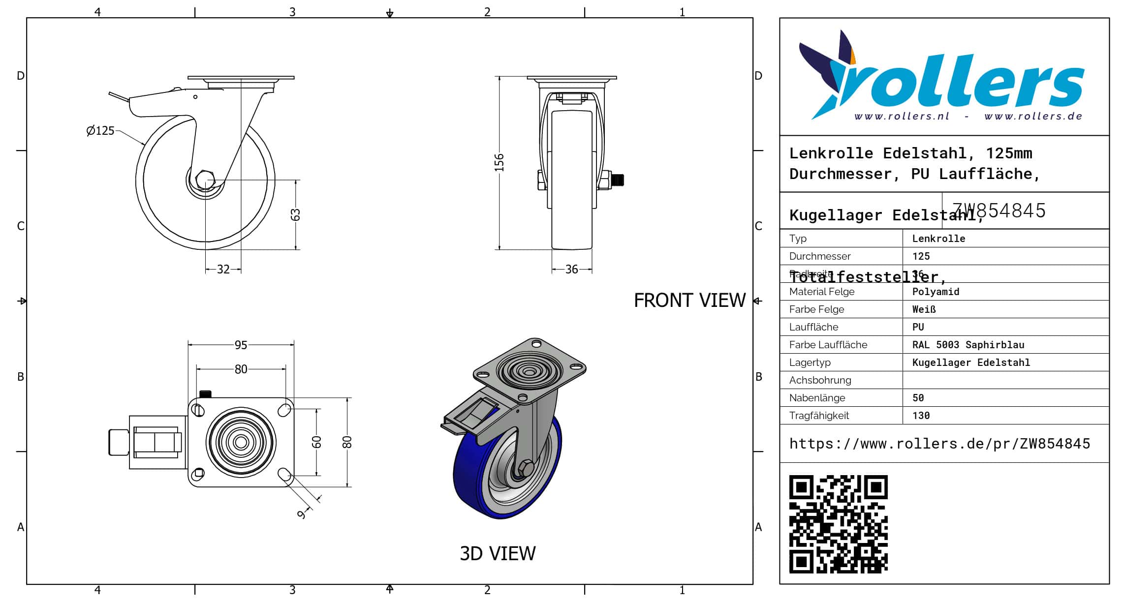 Diese Lenkrolle hat eine Gabel aus Edelstahl. Die Rolle hat eine Bremse des Typs Totalfeststeller, Nachlauf. Dies kann mit Befestigingsart „Platte“ befestigt werden. Die Bauhöhe beträgt 155 millimeter. Die Felge besteht aus Polyamid (weiß) und die Lauffläche aus PU (Farbe RAL 5003 Saphirblau). Das Rad hat einen Durchmesser von 125 millimeter und eine Breite von 36 millimeter. Das Rad hat eine Tragfähigkeit von 130 kilo. Der Lagertyp: Kugellager Edelstahl. Dieses Produkt finden Sie in unseren Kategorien: Rollbehälter Rollen, Müllcontainer Rollen, Lenkrolle Edelstahl, Lenkrollen 125 mm, PU Rollen, Polyurethan Rollen, Lenkrollen 100 kg, Transportrollen, Lenkrollen mit Bremse, Lenkrollen.
