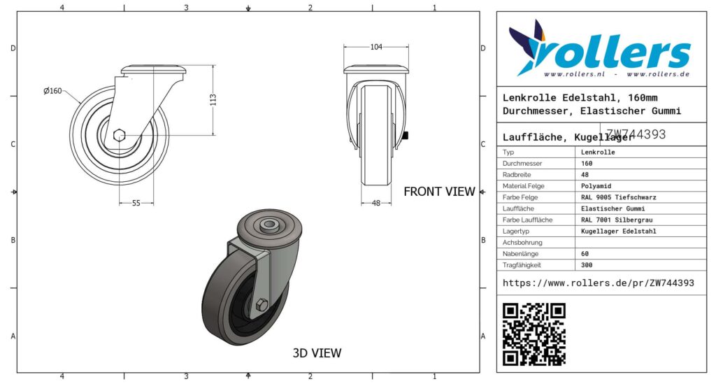 Diese Lenkrolle hat eine Gabel aus Edelstahl. Weise der Befestigung: Bolzenloch. Die Bauhöhe beträgt 193 millimeter. Die Felge besteht aus Polyamid (RAL 9005 Tiefschwarz) und die Lauffläche aus Elastischer Gummi (Farbe RAL 7001 Silbergrau). Das Rad hat einen Durchmesser von 160 millimeter und eine Breite von 48 millimeter. Die Rolle hat eine Tragfähigkeit von 300 kilo. Der Lagertyp: Kugellager Edelstahl.